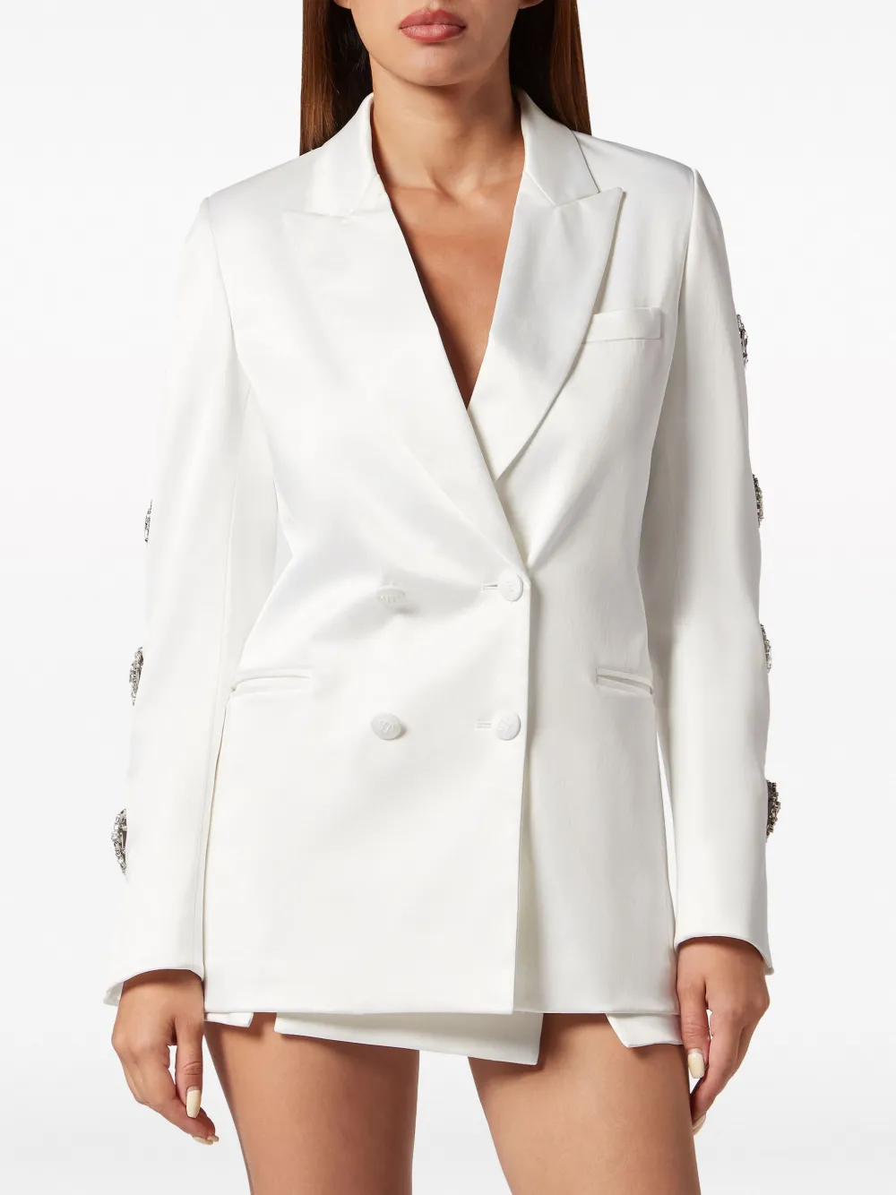 Белый, декор из кристаллов, вырезные детали, зазубренные лацканы, двубортная застежка на кнопки, длинные рукава, два прорезных кармана спереди, прорезной карман на груди и прямой подол.