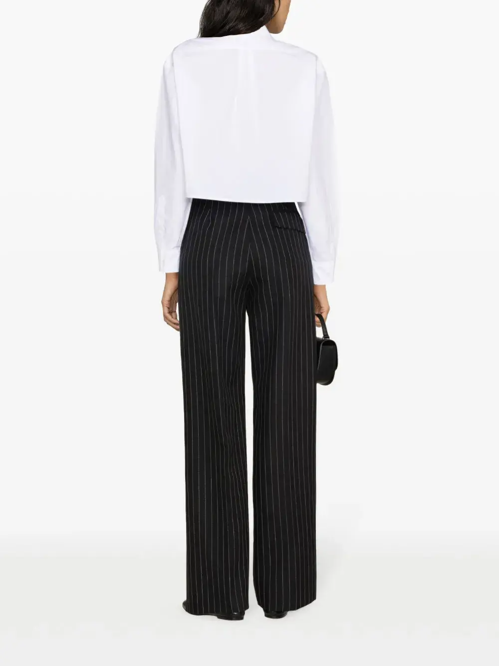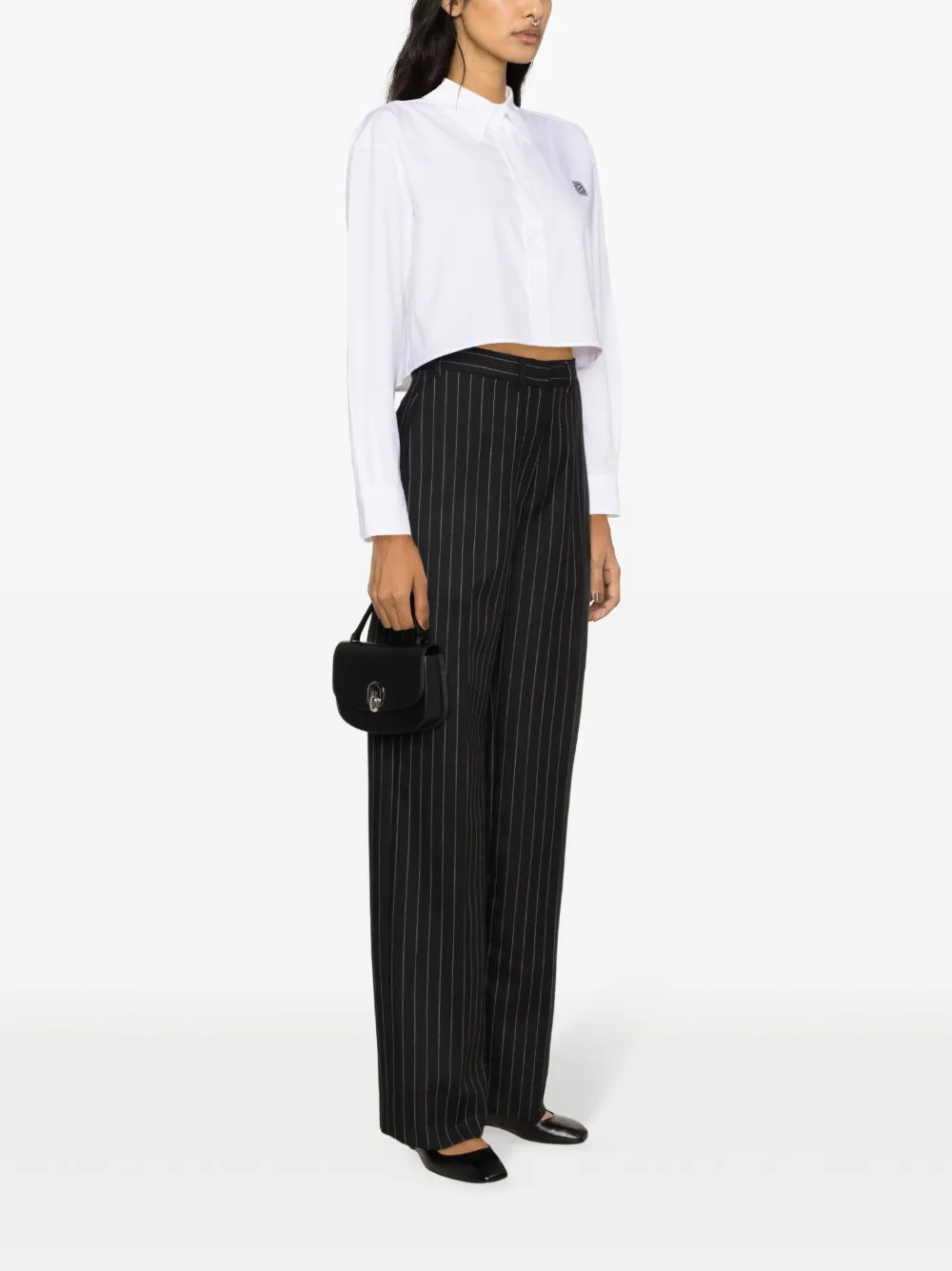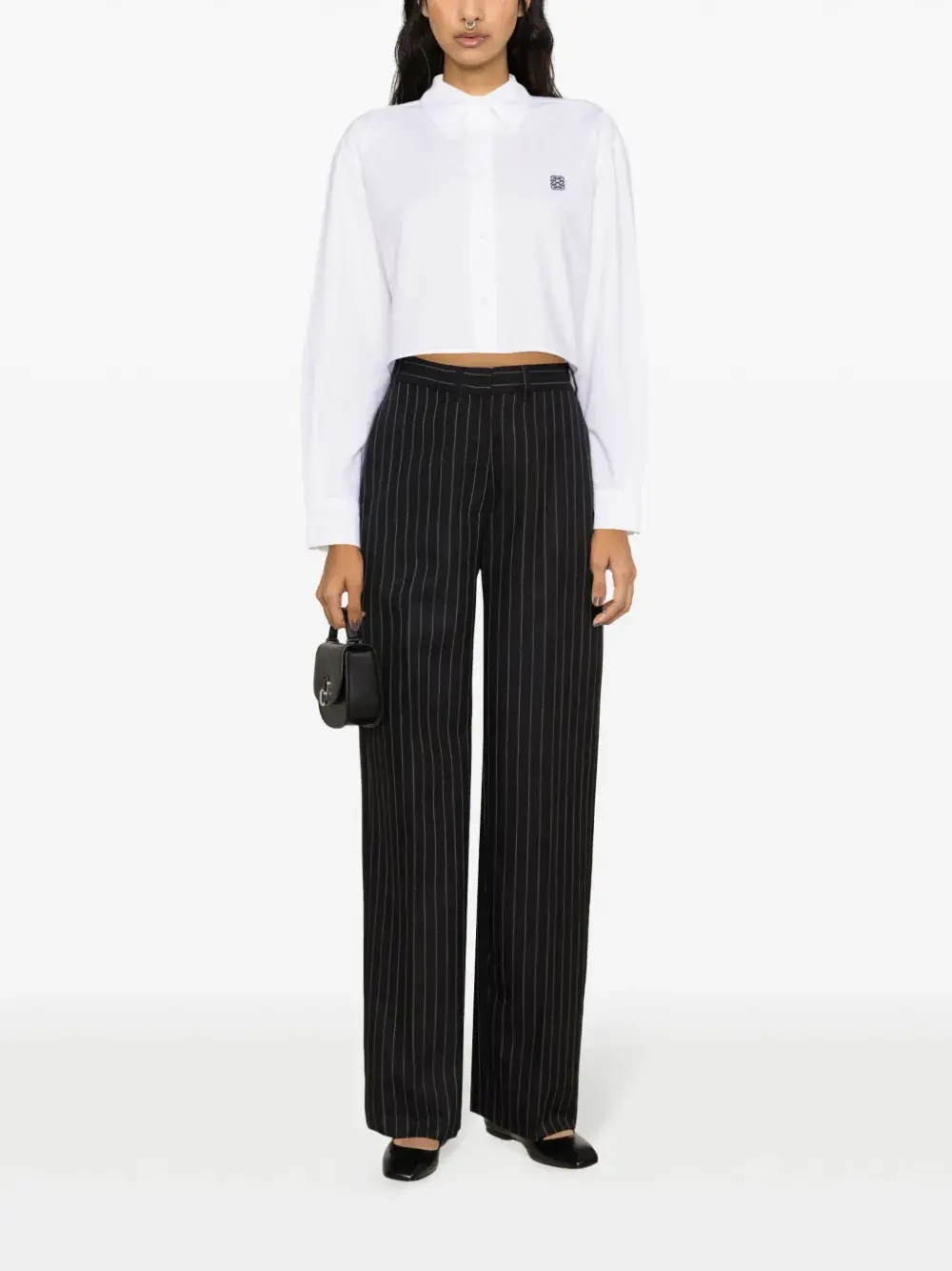 Вышитый логотип на груди, плоский заостренный воротник, застежка на пуговицах спереди, длинные рукава, манжеты на пуговицах, прямой подол и укороченная длина.