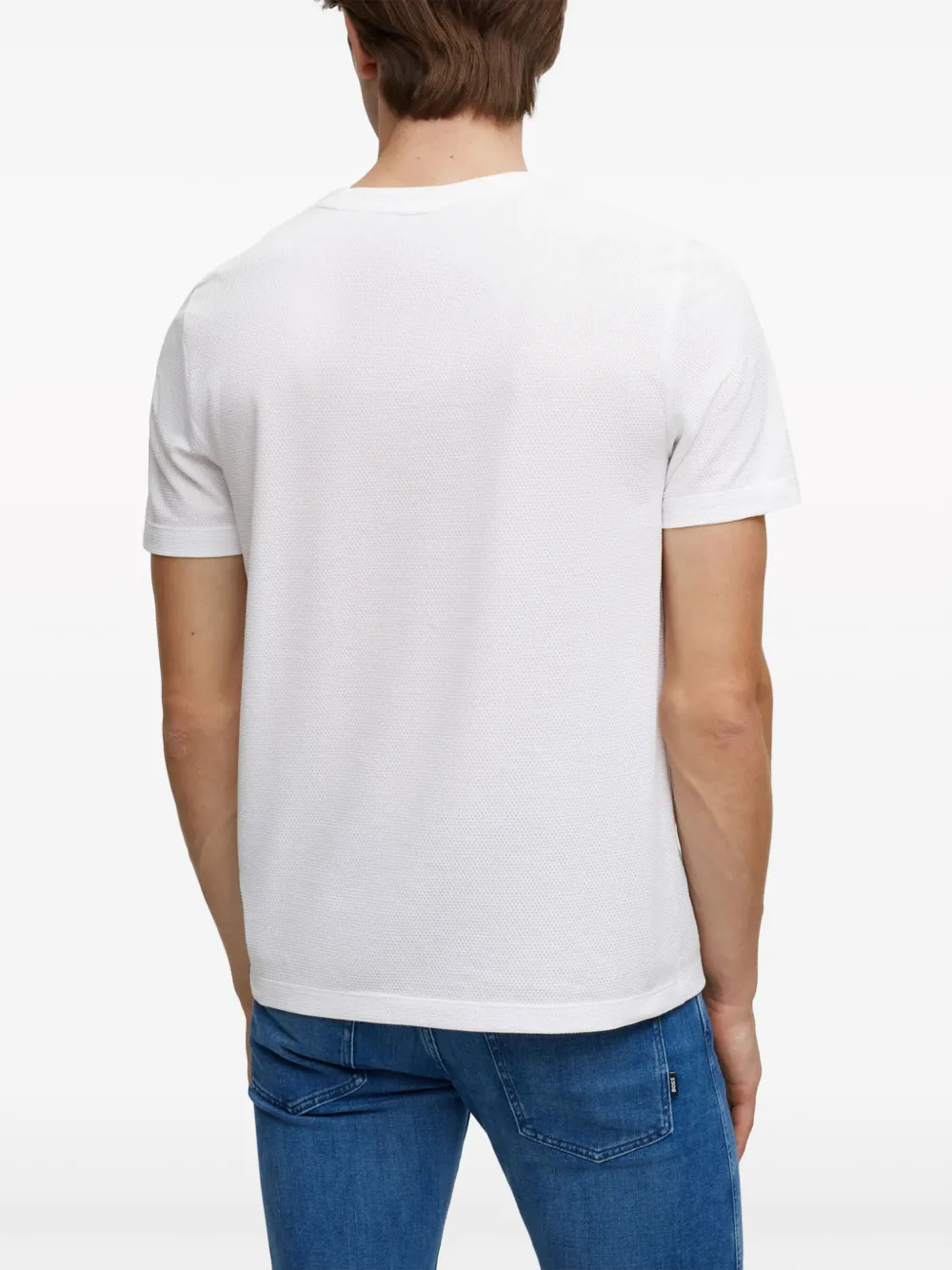 Белый, хлопок, ткань джерси, жаккардовая модель, короткие рукава, прямой подол, круглый вырез и бирка с логотипом.