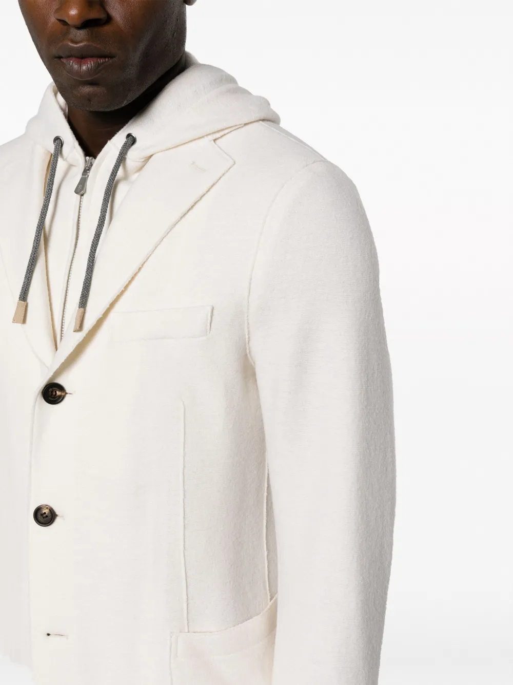 Кремово-белый, шерсть, многослойный дизайн, серебристая фурнитура, пуговицы с тисненым логотипом, затягивающийся на шнурок капюшон, застежка на молнии и пуговице спереди, длинные рукава, манжеты на пуговицах, две боковые шлицы сзади, прорезной карман на груди и два накладных кармана спереди.