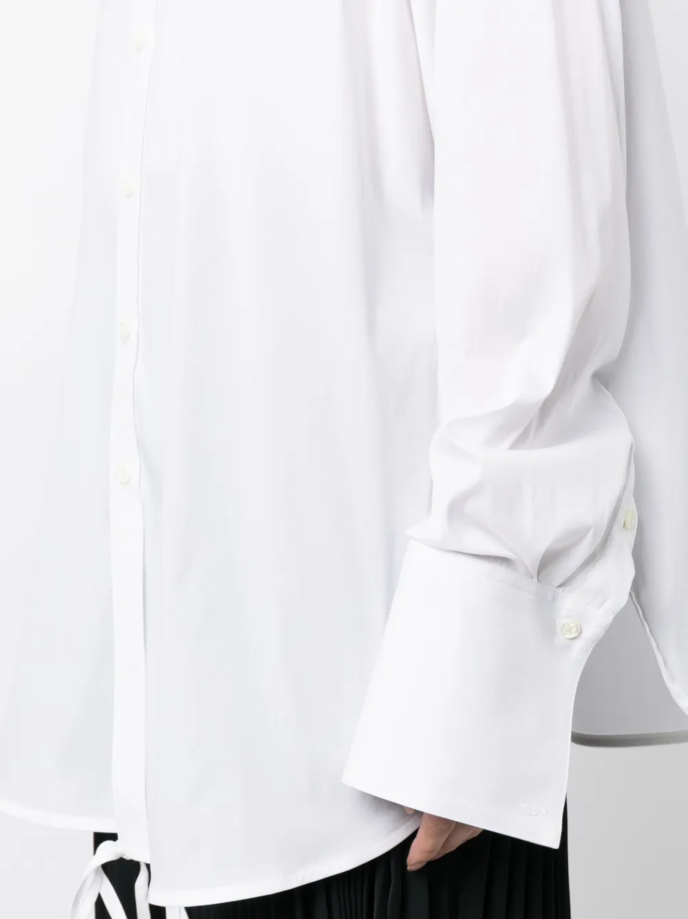 Кремовый, смесовый хлопок, классический воротник, застежка на пуговицах спереди, приспущенные плечи, длинные рукава, манжеты на пуговицах, завязки спереди и закругленный подол.