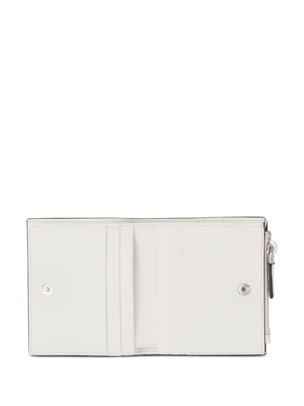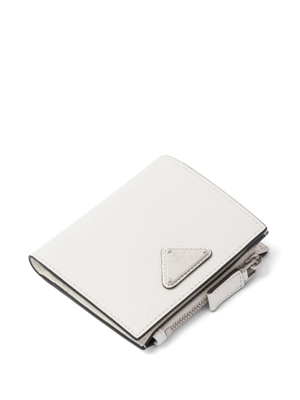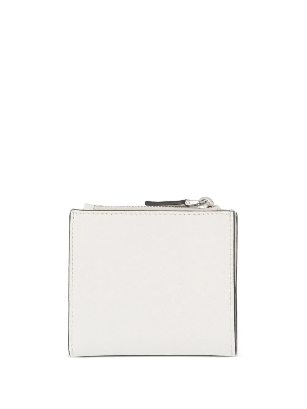 Белый, кожа, треугольный эмалированный логотип, два сложения, откидной верх с застежкой на кнопки, карман на молнии, внутренние отделения для карт и отделение для купюр.