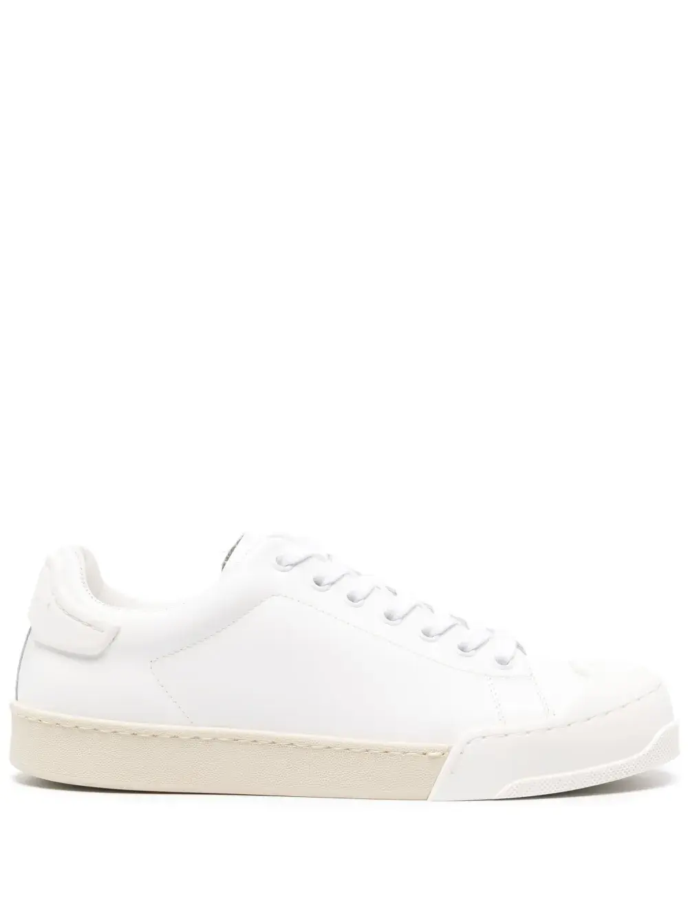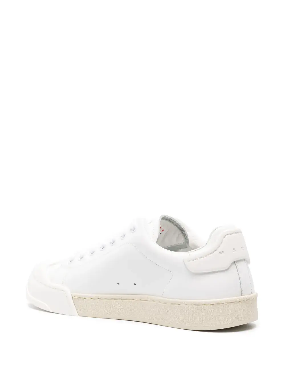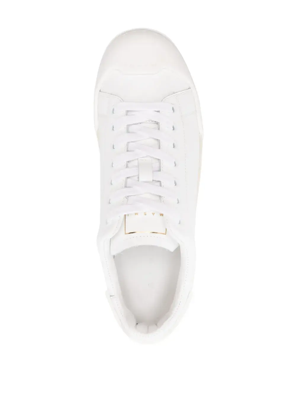 Белый, телячья кожа, тисненый логотип спереди, язычок с логотипом, задник с логотипом, закругленный носок, резиновый носок, шнуровка спереди, стелька с логотипом и плоская резиновая подошва.