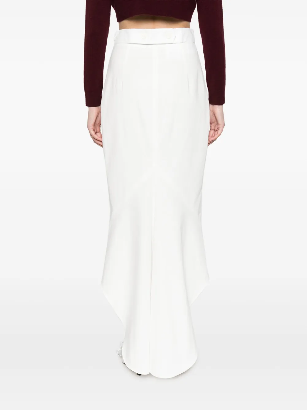 Белый, хлопок, завышенная талия, два накладных кармана спереди, волнистая юбка, неравномерный подол и длина миди.