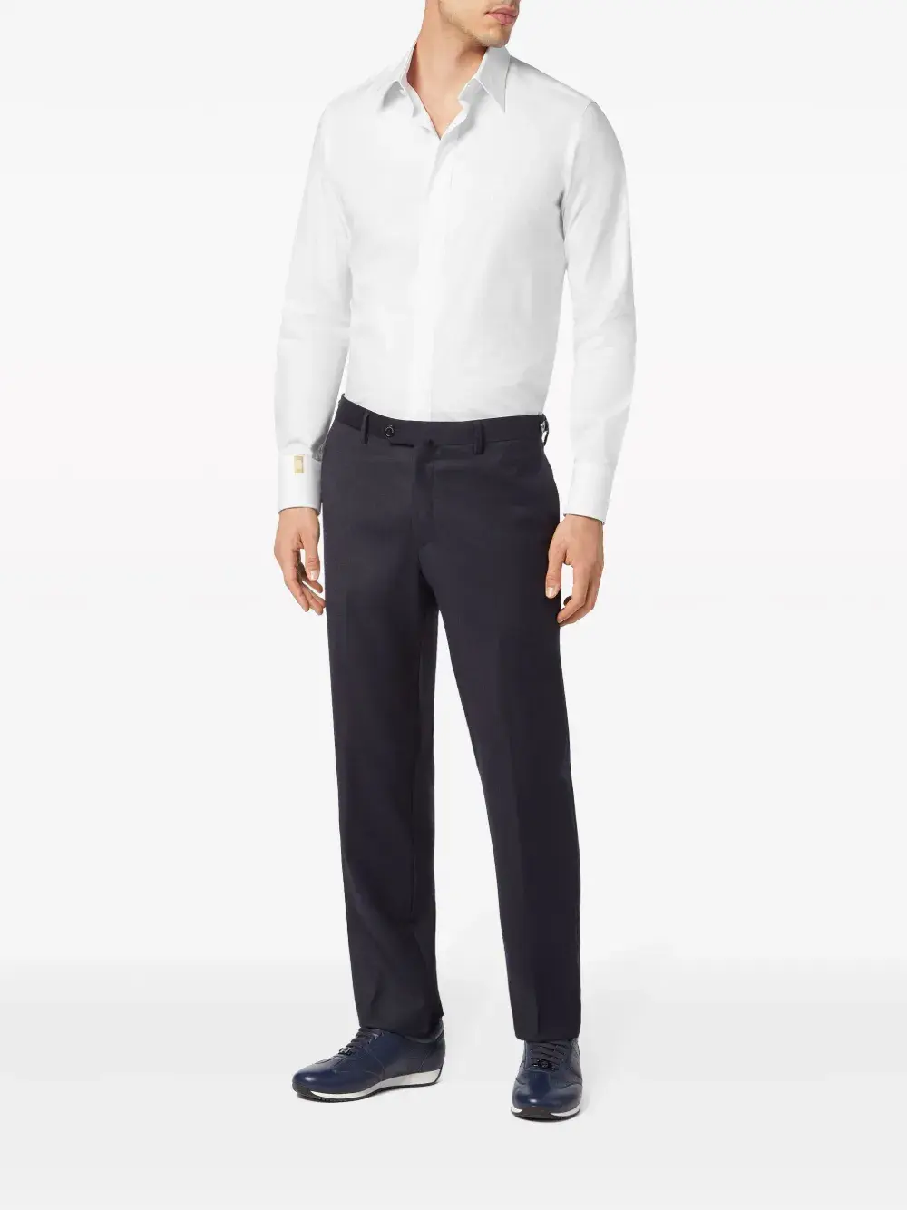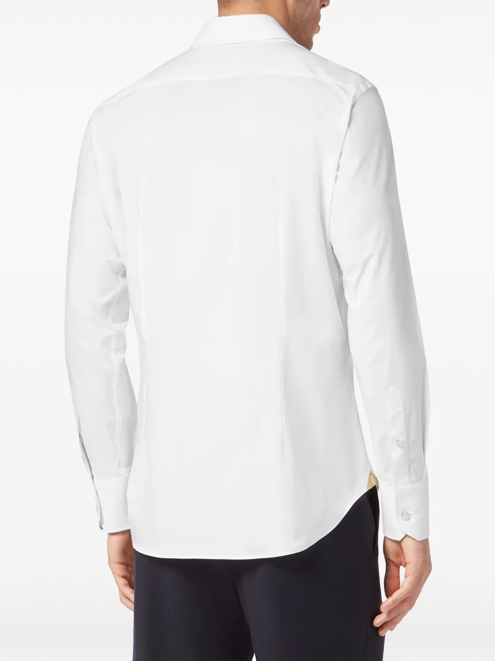Белый, эластичный хлопок, узкий крой, строчка в тон, вышитый логотип на груди, маленькая подвеска с логотипом, плоский заостренный воротник, потайная пуговичная застежка спереди, длинные рукава, манжеты на пуговицах и закругленный подол.