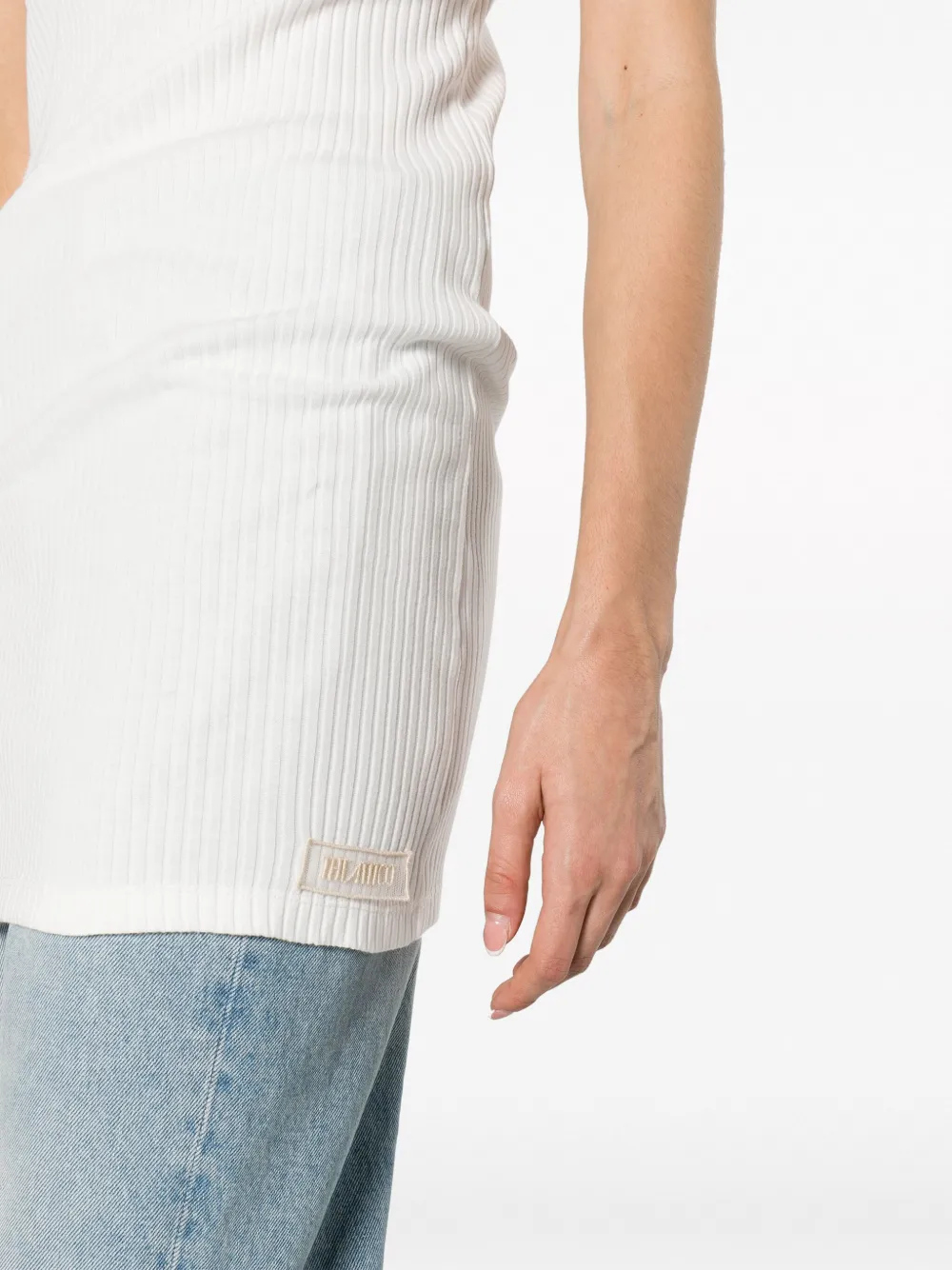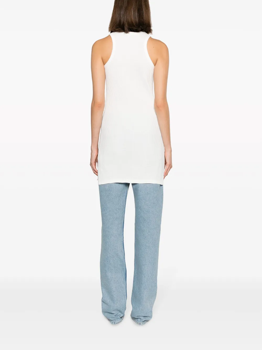 Белый, хлопок, детали в рубчик, нашивка с логотипом спереди, круглый вырез, без рукавов, вырез рейсер и прямой подол.