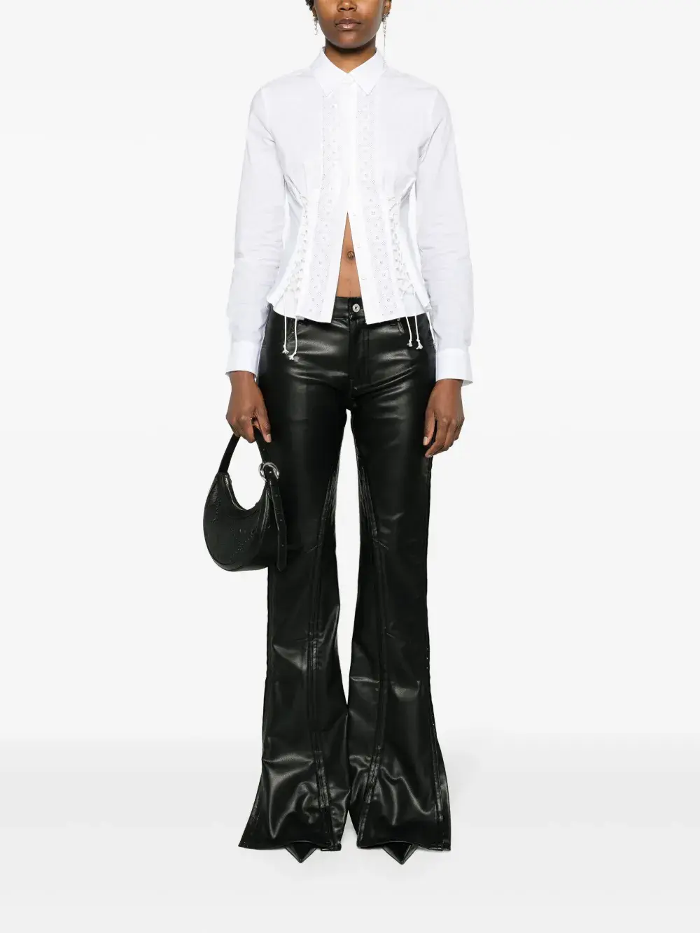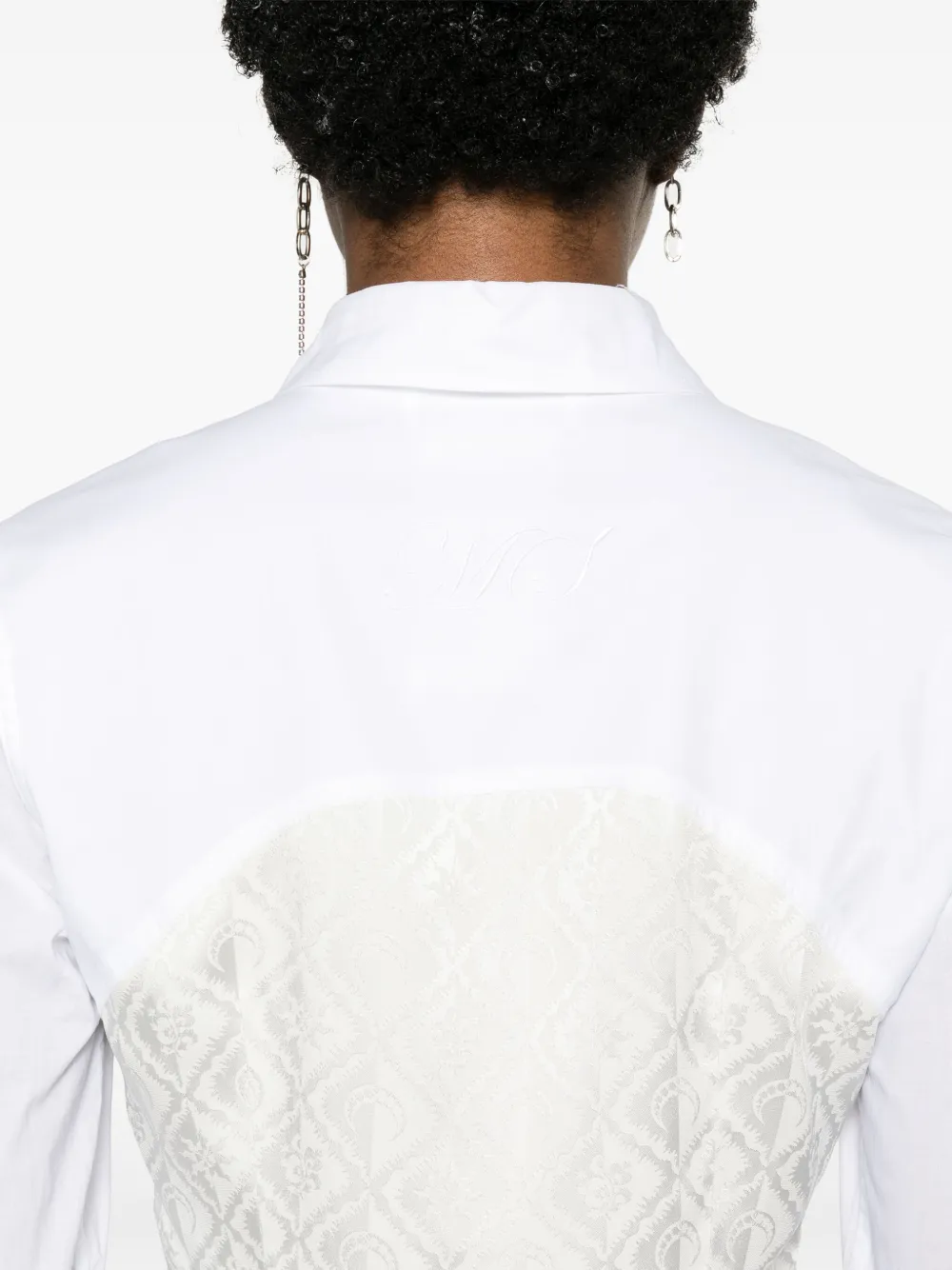 Подробнее о товаре: • белый • хлопок • поплин • дизайн со вставками • верх в корсетном стиле • кружевная отделка • вышитый логотип сзади • жаккард с монограммой • защипы • классический воротник • потайная пуговичная застежка спереди • шнуровка спереди • длинные рукава • манжеты на пуговицах • закругленный подол • Эта вещь изготовлена из переработанных материалов, поэтому ее внешний вид может незначительно отличаться от фотографий.