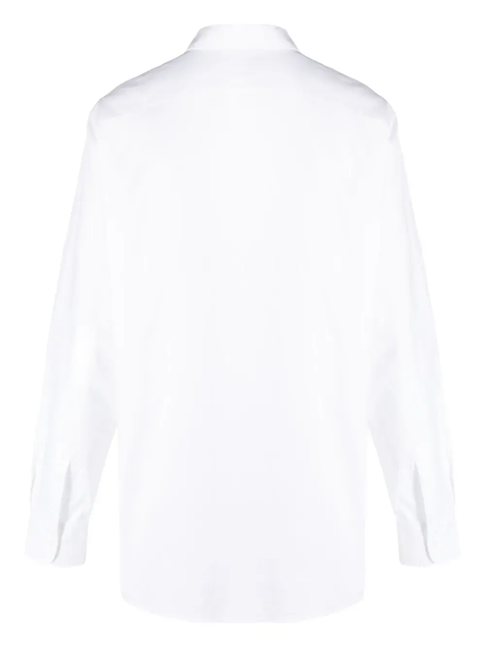 Белый, хлопок, классический воротник, застежка на пуговицах спереди, длинные рукава, манжеты на пуговицах и закругленный подол.