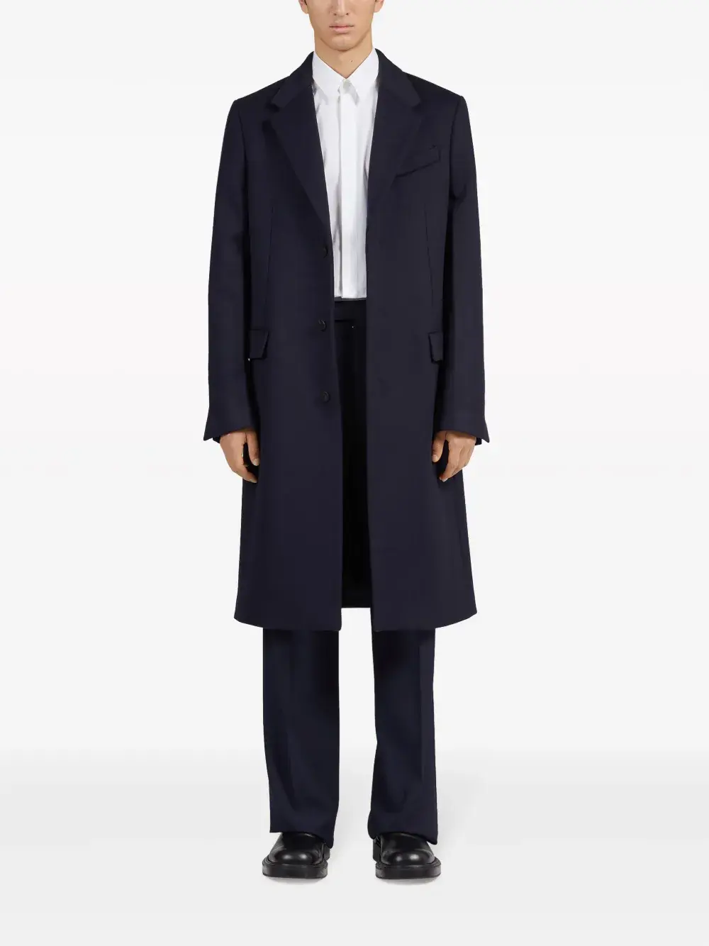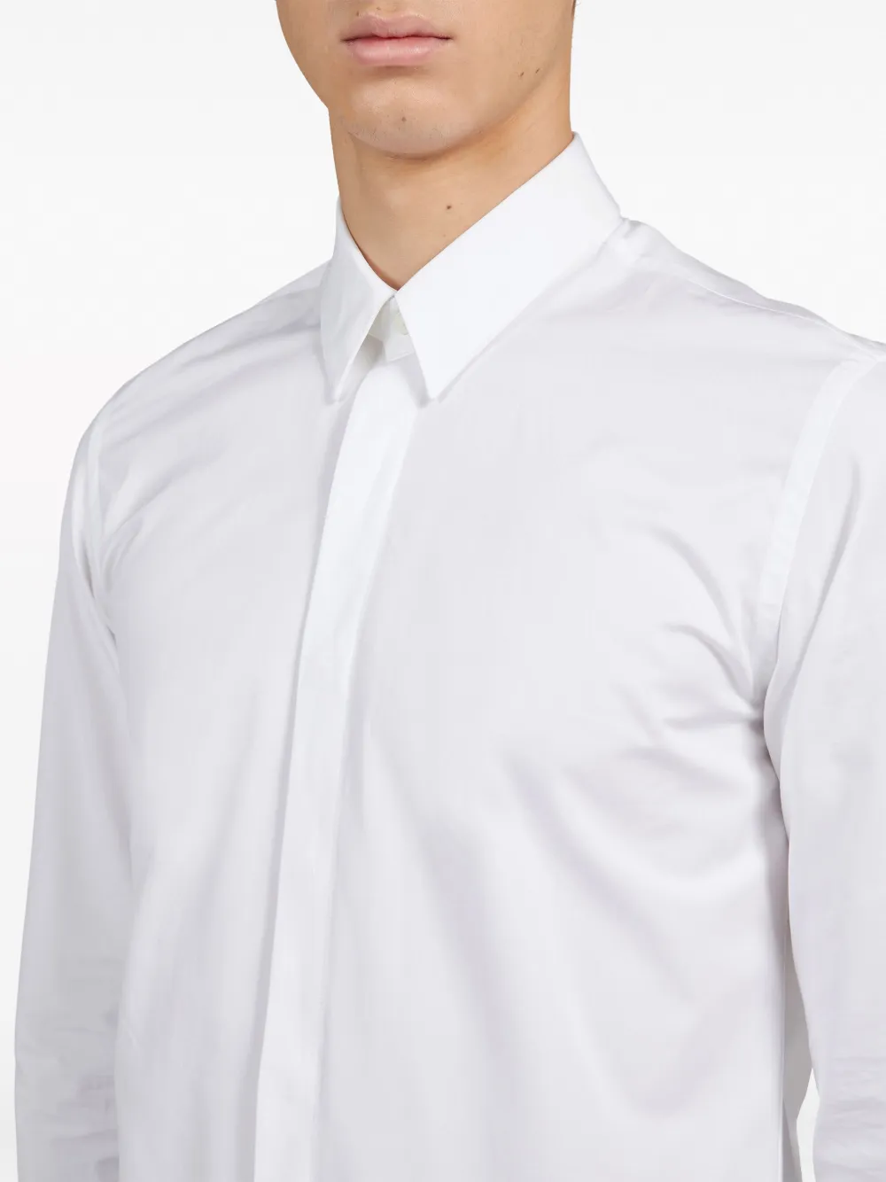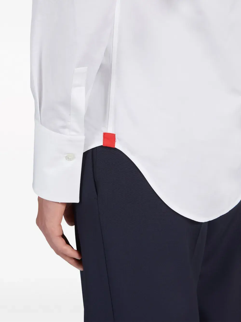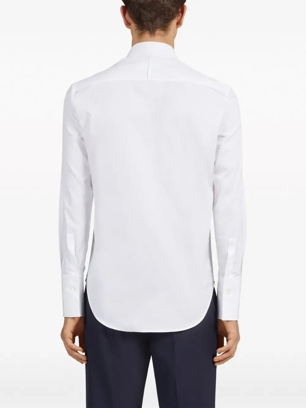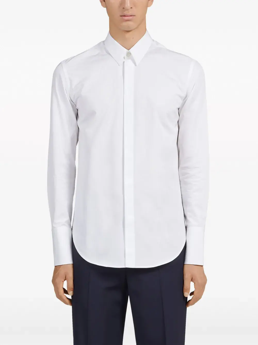 Белый, хлопок, классический воротник, застежка на пуговицах спереди, длинные рукава, манжеты на пуговицах и закругленный подол.