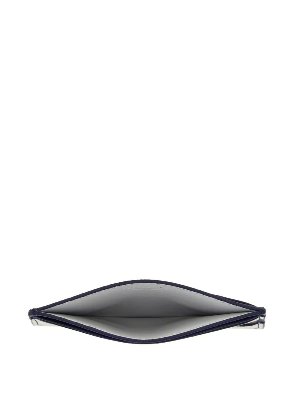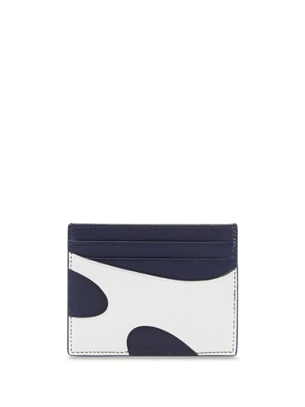 Белый, темно-синий, телячья кожа, зернистая текстура, вставки, вырезные детали, тисненый логотип спереди и отделения для карт.