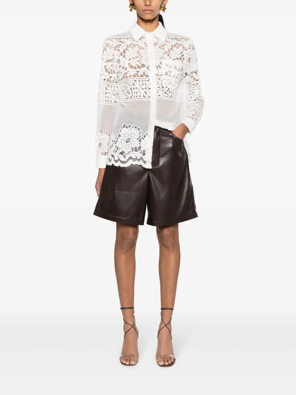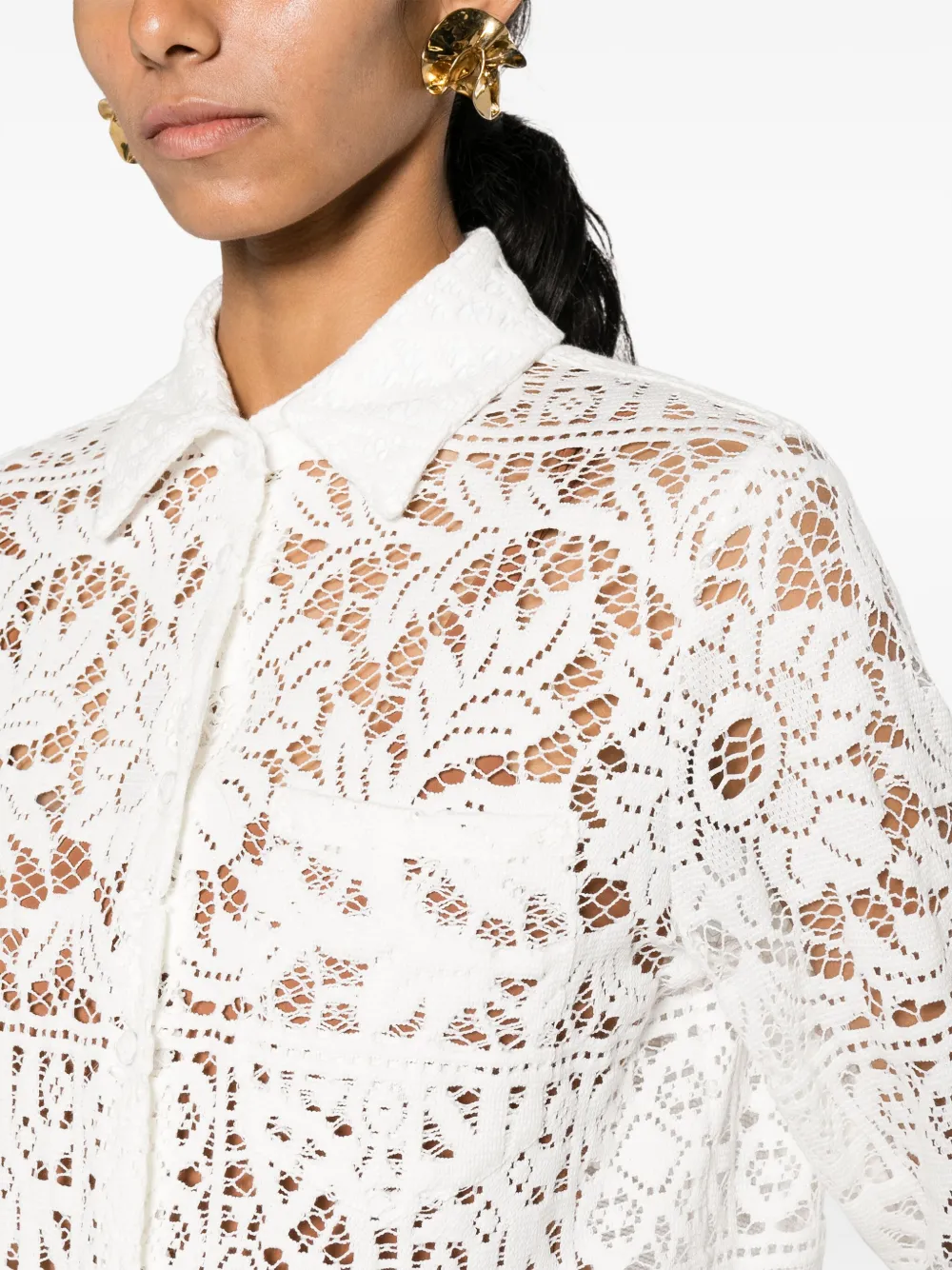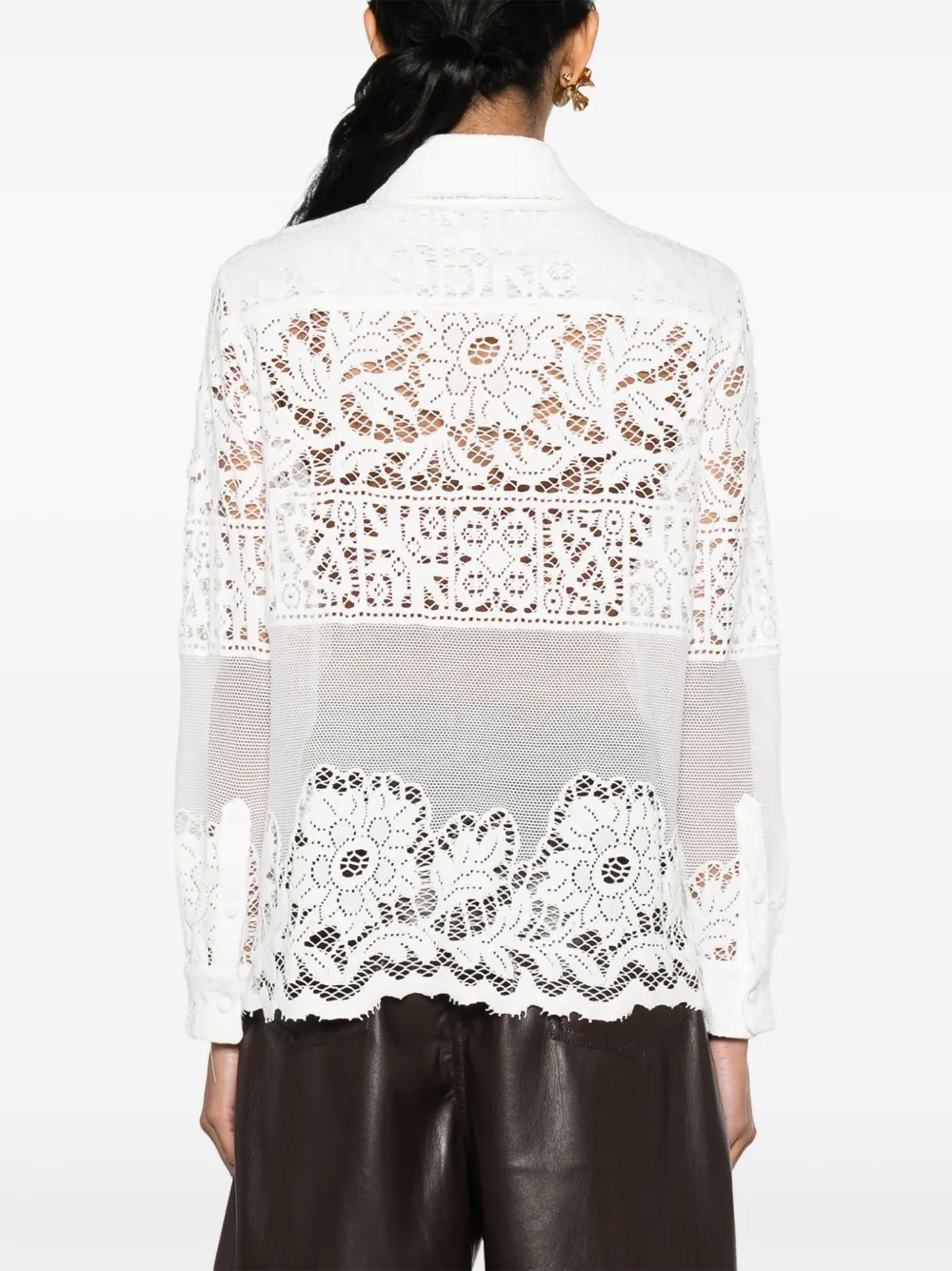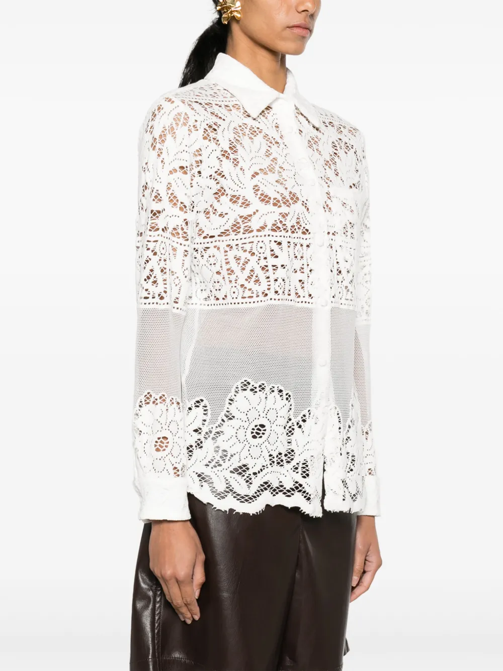 Белый, хлопок, кружевная вышивка, прозрачный материал, сетчатые вставки, классический воротник, застежка на пуговицах спереди, длинные рукава, манжеты на пуговицах, нагрудный накладной карман и подол с фестонами.