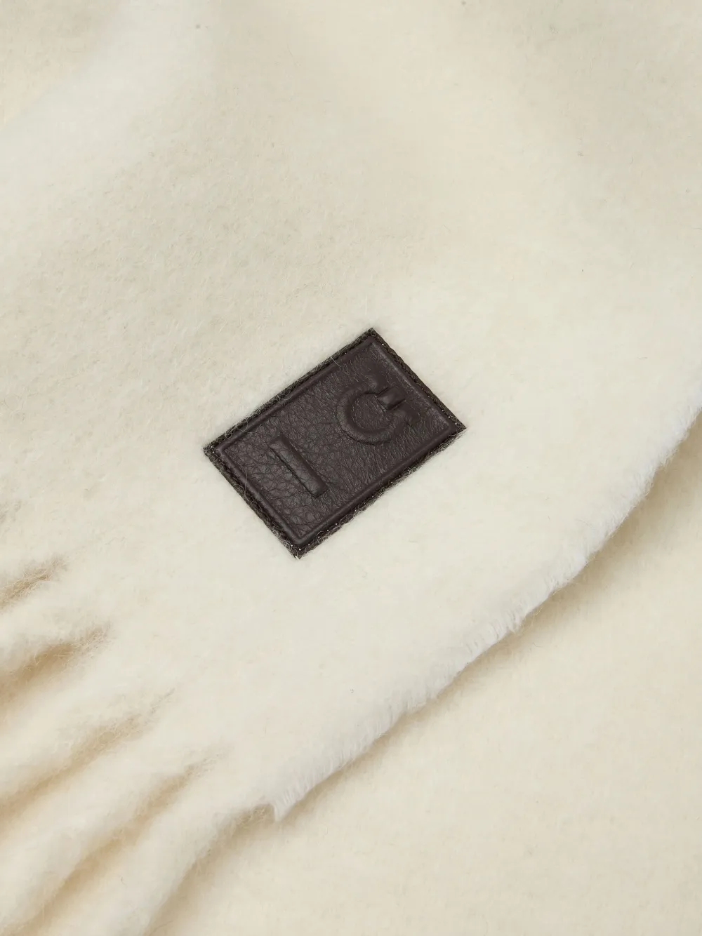 Кремово-белый, смесовая шерсть альпаки, нашивка с логотипом спереди, матовый эффект и края с бахромой.