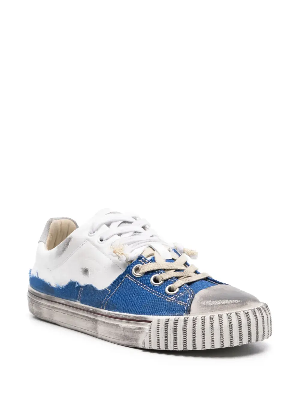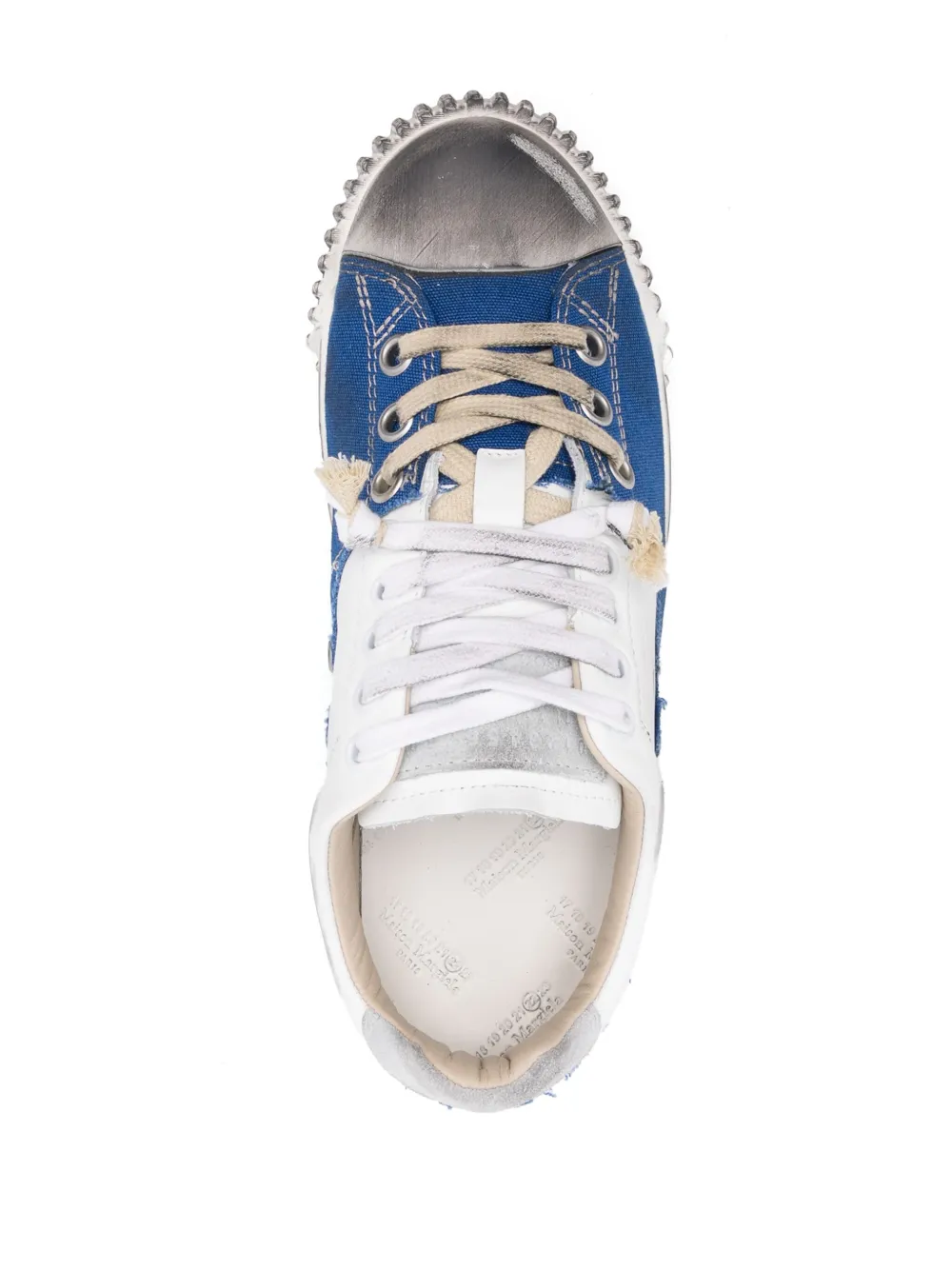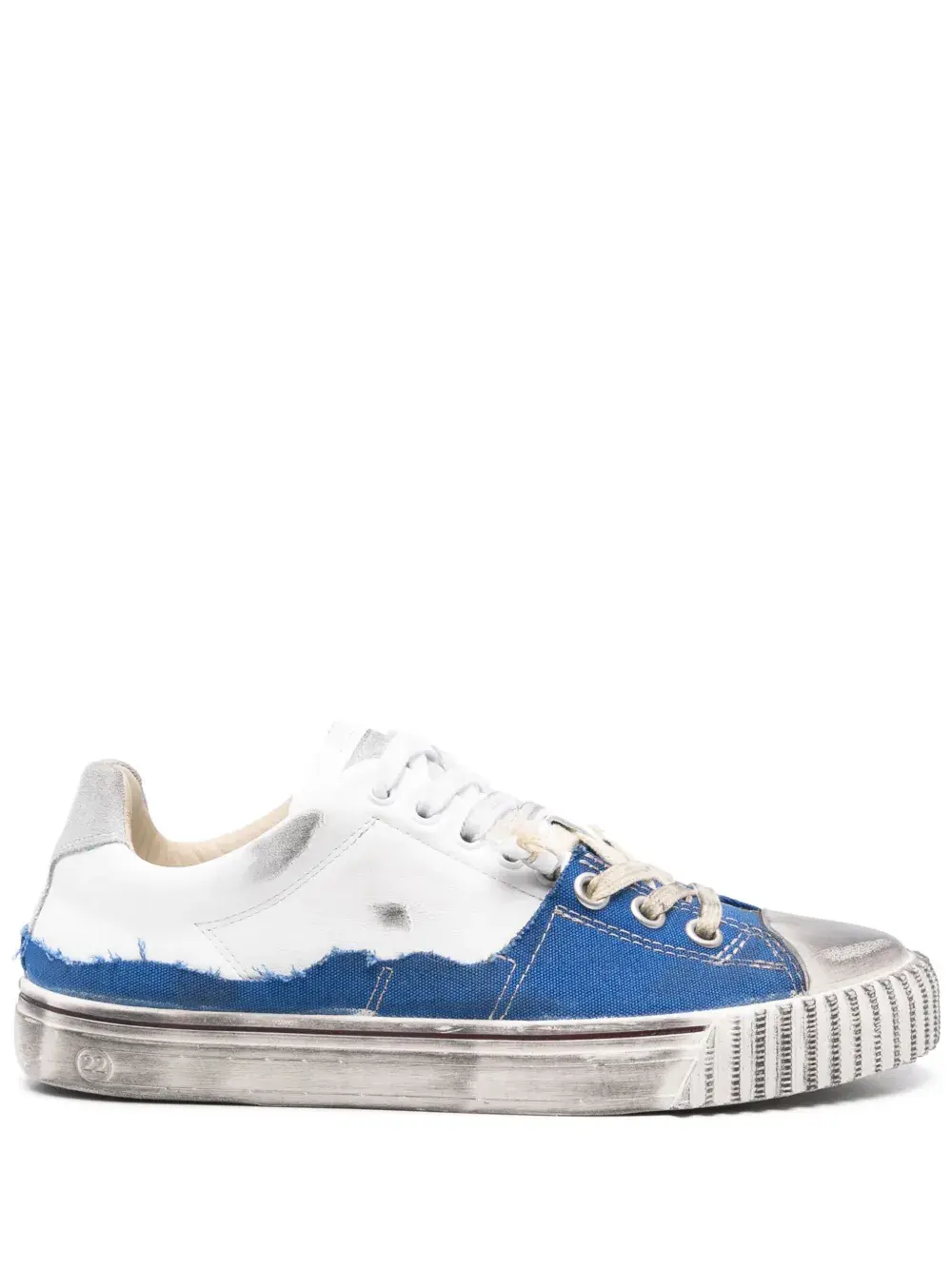 Подробнее о товаре: • белый/синий • канвас/кожа • эффект потертости • закругленный носок • резиновый носок • отделка металлическими люверсами • знаковая нашивка с цифрами на язычке • знаковый логотип-стежок сзади • уплотненная щиколотка • съемная кожаная стелька с логотипом • плоская резиновая подошва • шнуровка спереди • В комплект входит мешок-пыльник для хранения.