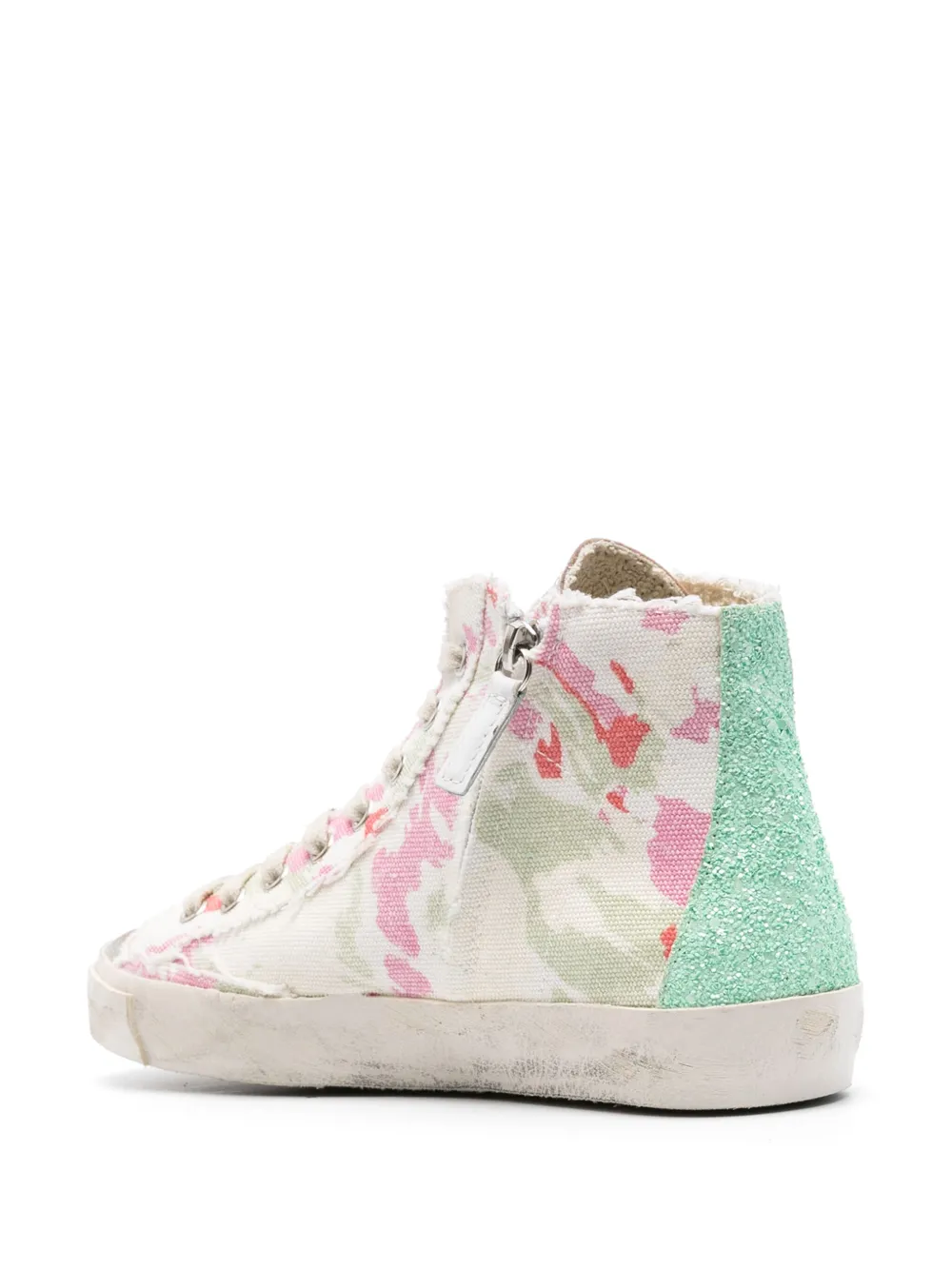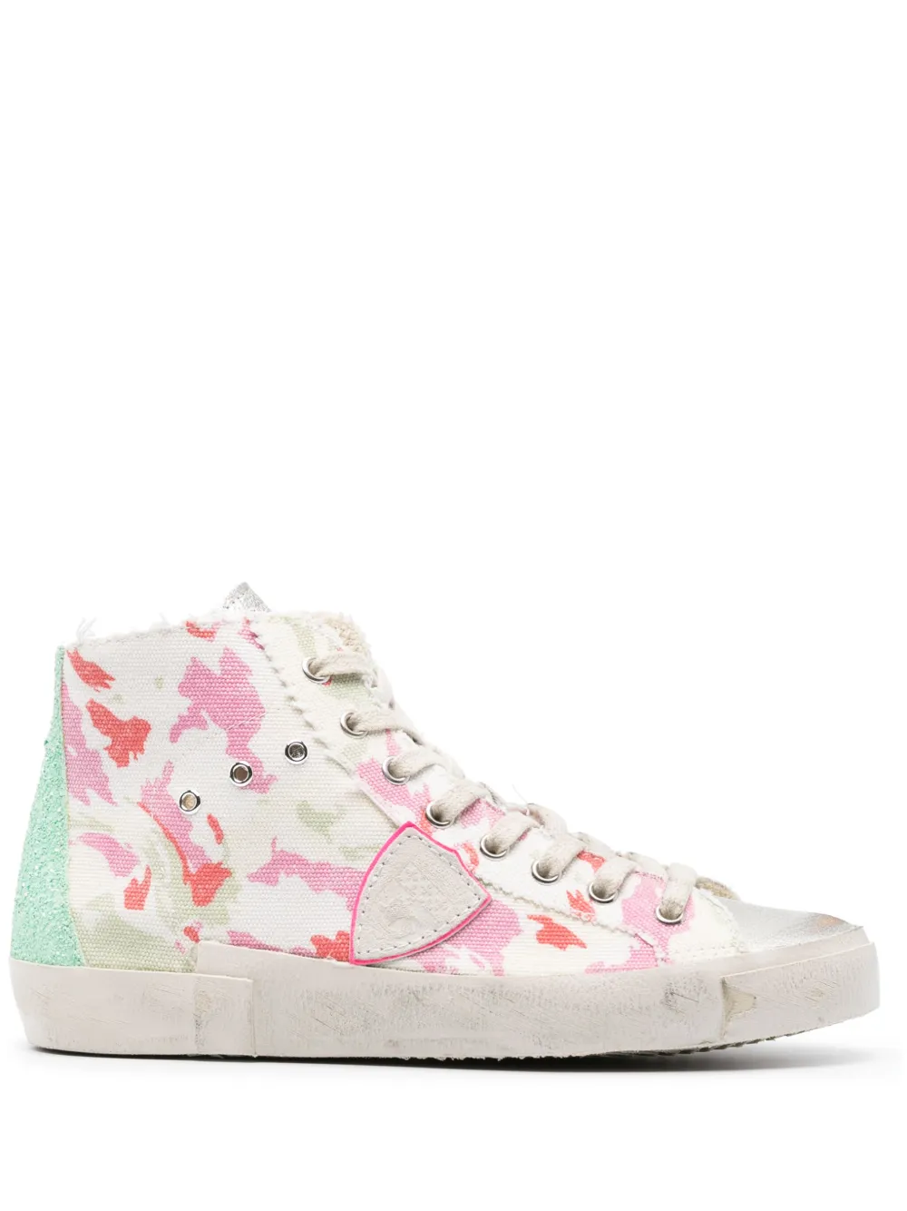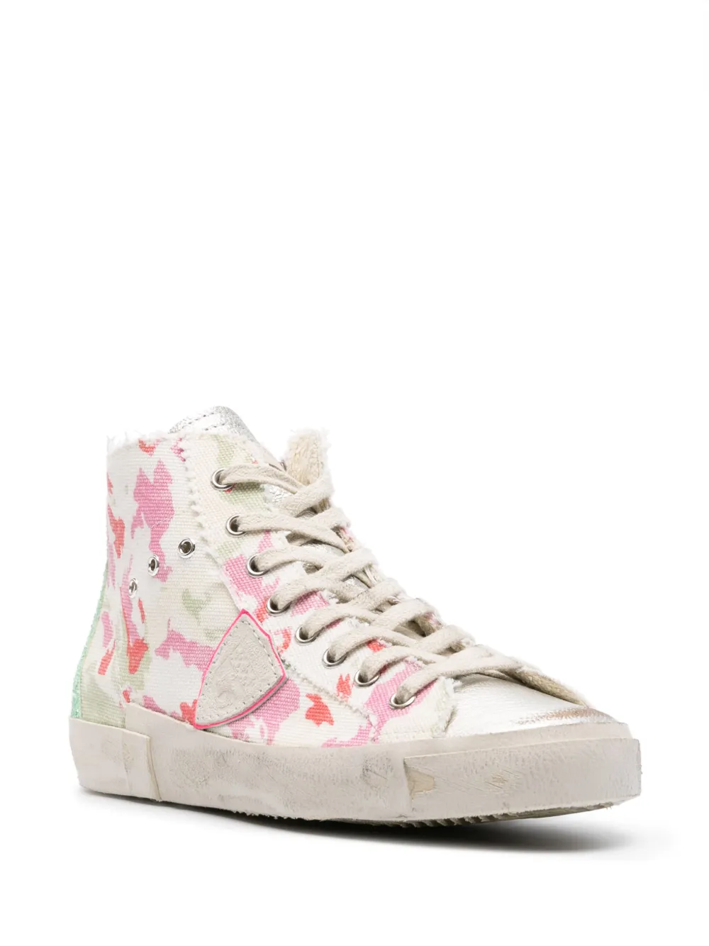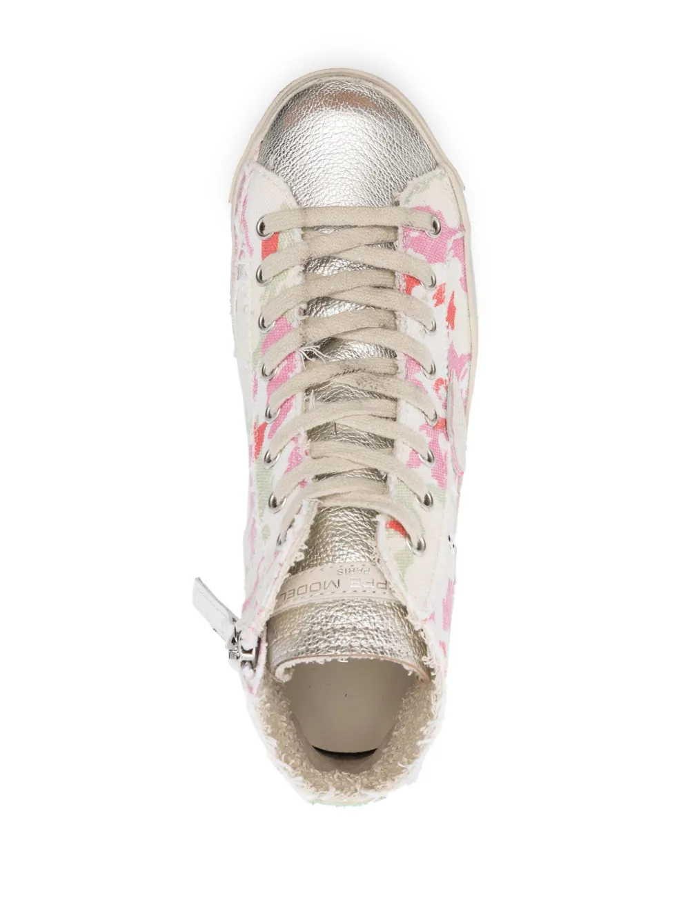 Кремовый, разноцветный, телячья кожа, абстрактный принт, люверсы, нашивка с логотипом сбоку, нашивка с логотипом на язычке, закругленный носок, шнуровка спереди, застежка на молнии сбоку, стелька с логотипом и плоская резиновая подошва.