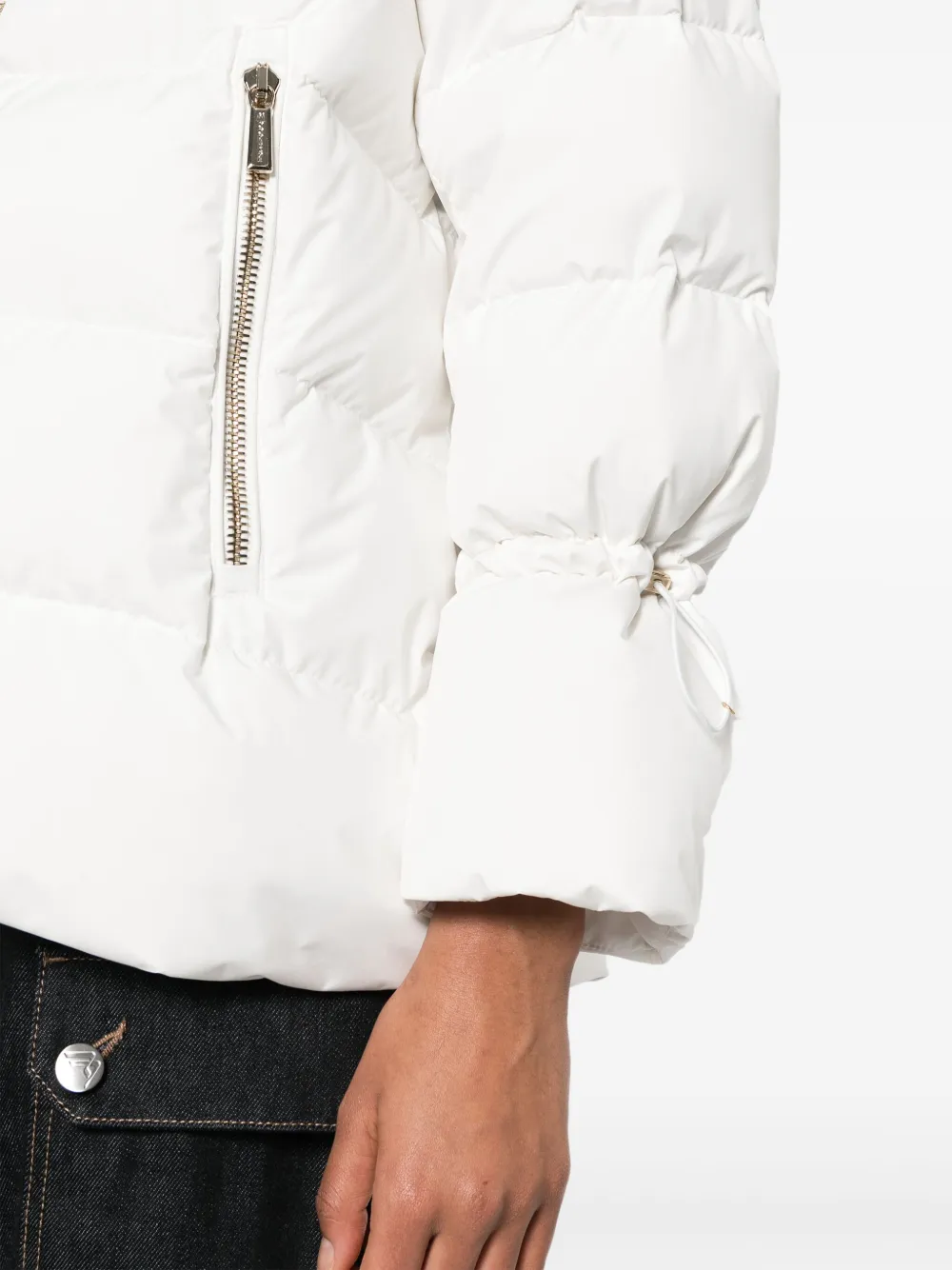 Водонепроницаемый материал, затягивающийся на шнурок капюшон, воротник-труба, двусторонняя молния спереди, манжеты с кулиской, передние карманы на молнии, подол с кулиской и стеганая подкладка.