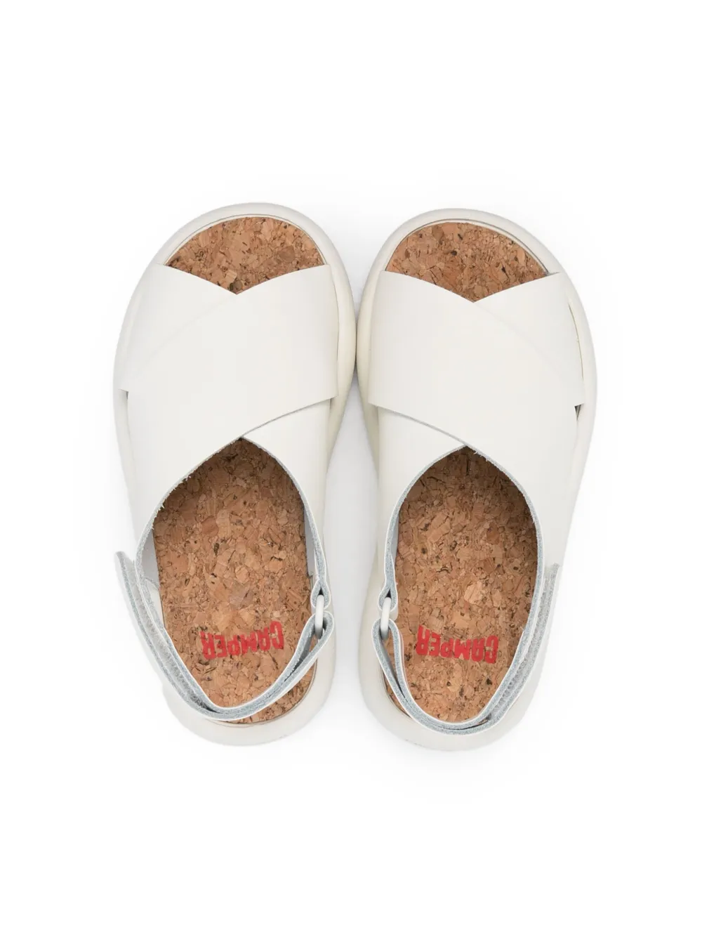 Слоновая кость, кожа, браслет в два оборота, закругленный открытый носок, застежка на липучке сзади, логотип на стельке, пробковая подошва и плоская подошва.