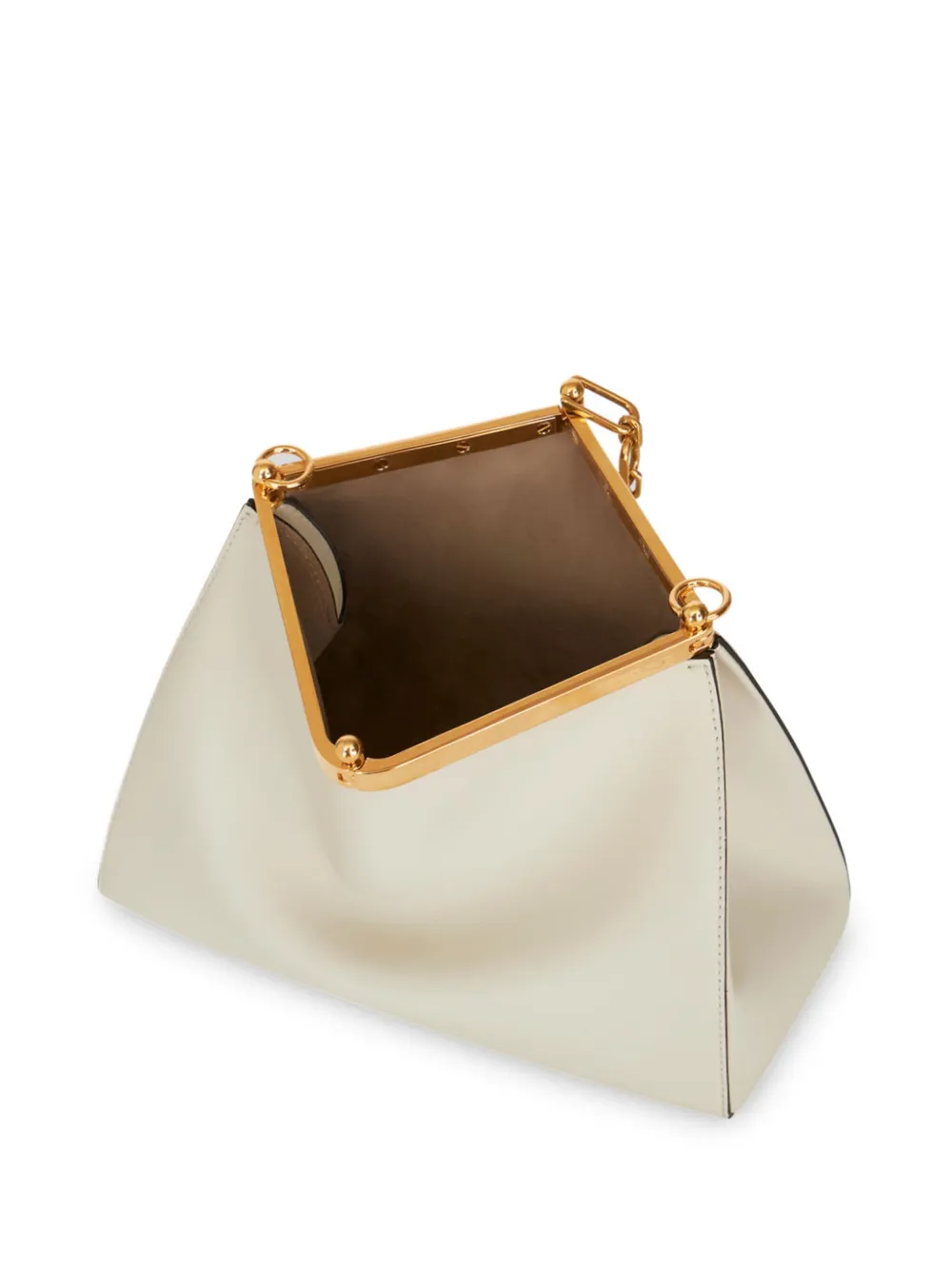 Кремово-белый, кожа, золотистая фурнитура, узор Pegaso, застежка на зажиме, съемный ремень на плечо, съемный ремень на плечо, основное отделение, съемная косметичка и металлические ножки.