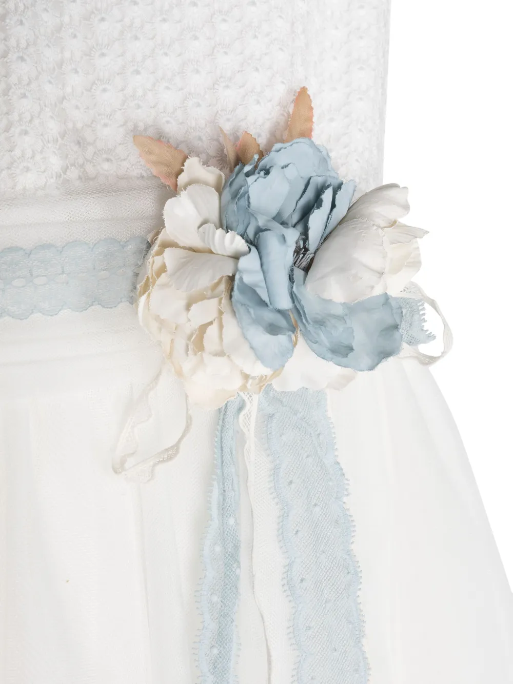 Цветочная аппликация, вставки из кружева, потайная застежка на молнии сзади, кулиска на талии и длинная модель.