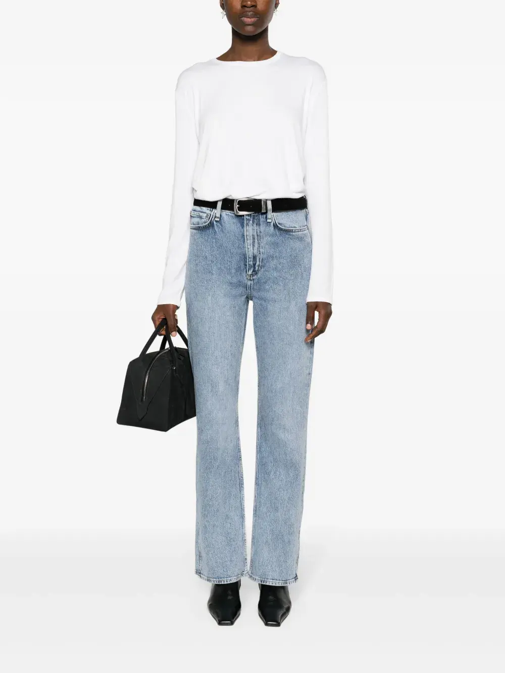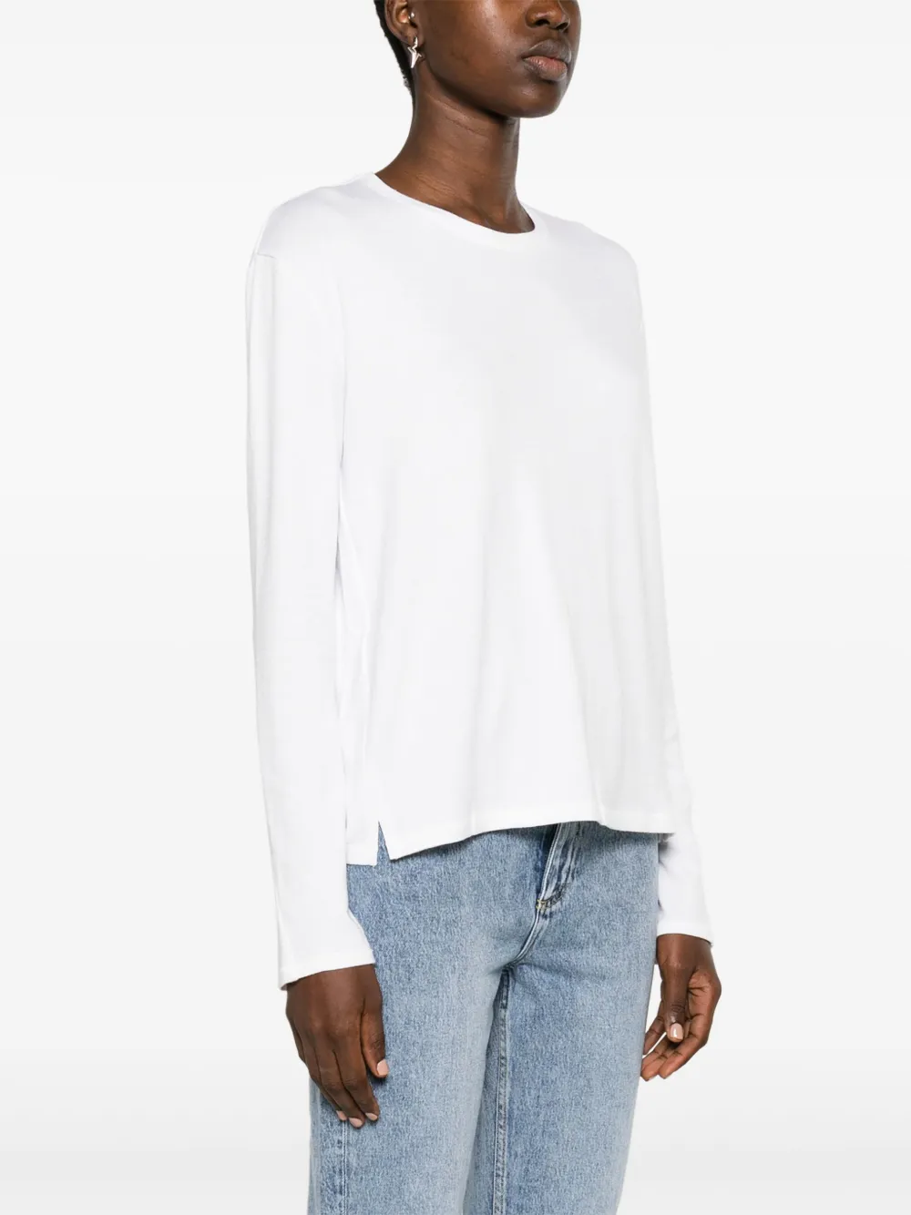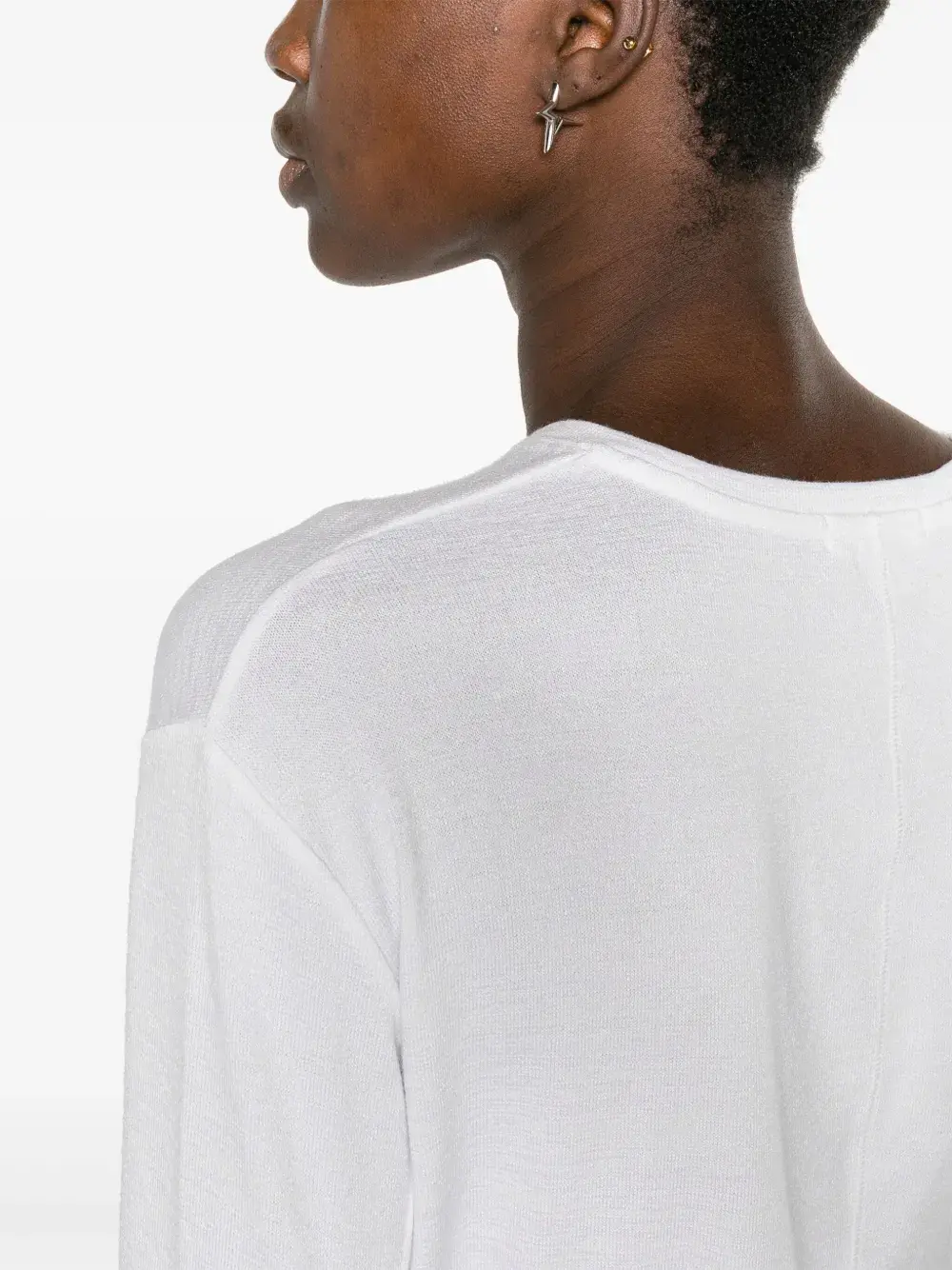 Белый, трикотаж в рубчик, эластичный материал, круглый вырез, приспущенные плечи, длинные рукава, прямой подол и модель без подкладки.