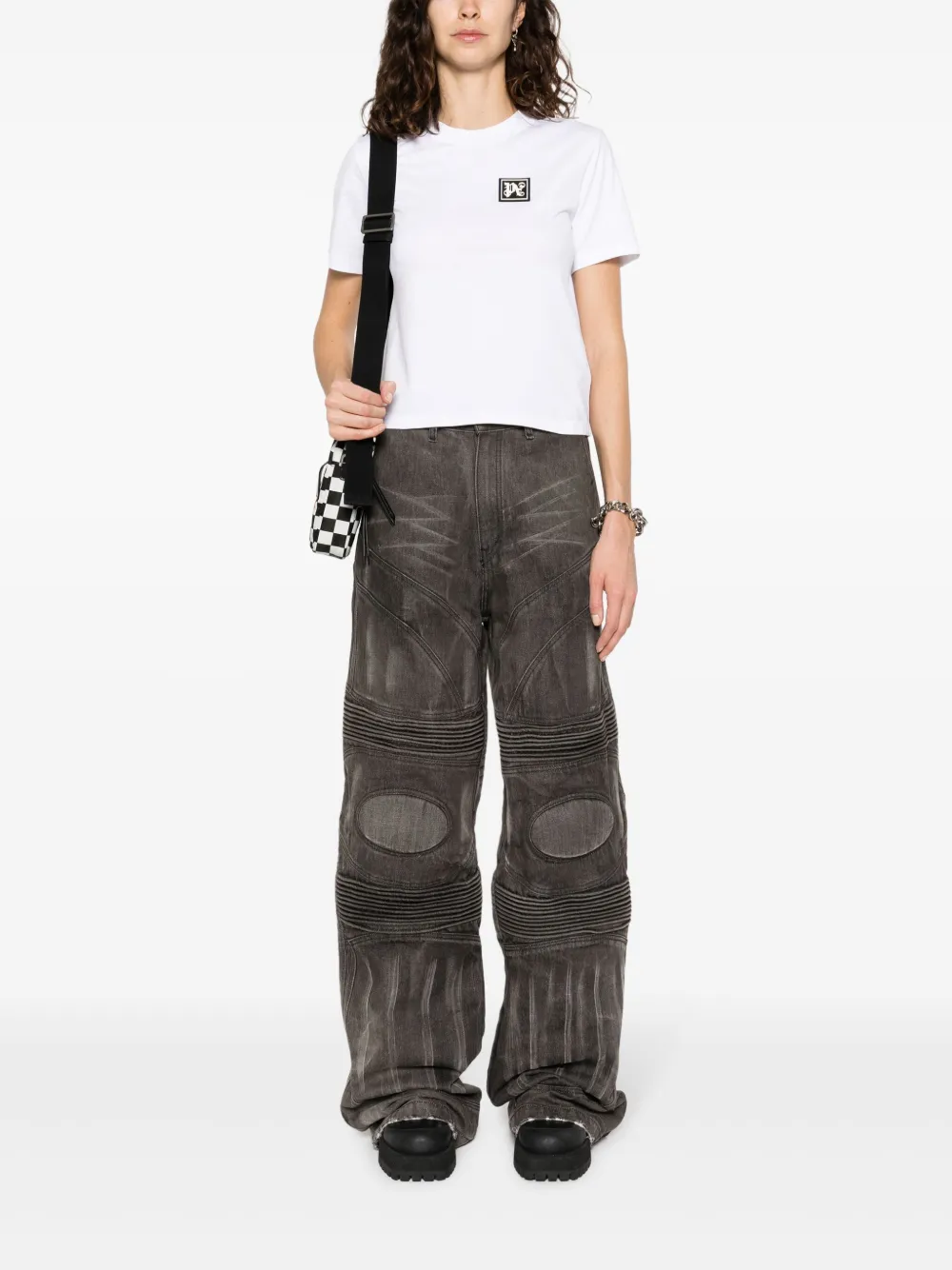 Белый, хлопок, круглый вырез, короткие рукава, нашивка с логотипом спереди, принт с логотипом сзади и прямой подол.