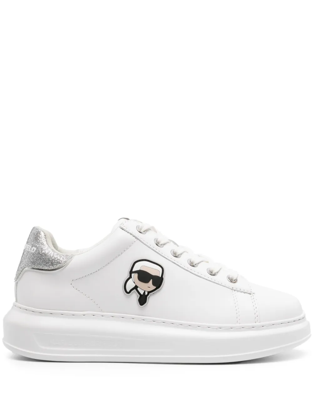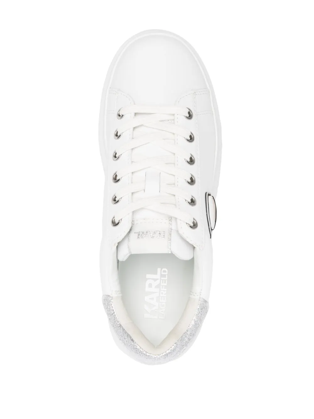 Подробнее о товаре: • белый/серебристый • телячья кожа • знаковая аппликация Ikonik Karl • деталь с блестками • нашивка с логотипом на язычке • контрастный задник с логотипом • тисненый логотип сбоку • закругленный носок • шнуровка спереди • уплотненная щиколотка • кожаная подкладка • стелька с логотипом • массивная резиновая подошва • В комплект входит мешок-пыльник для хранения.
