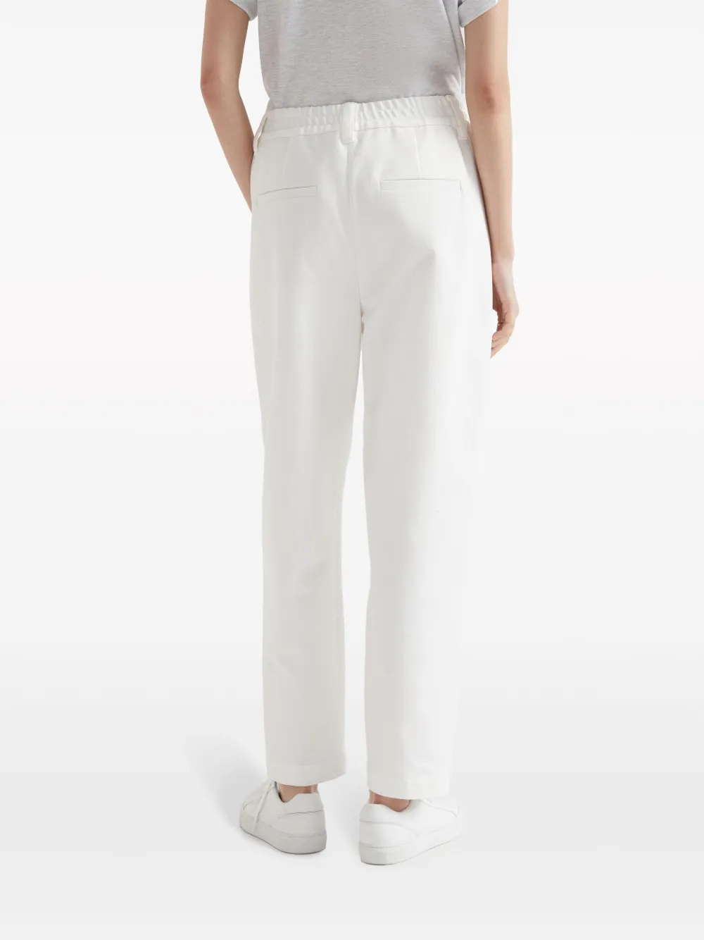 Белый, смесовый хлопок, складки, эластичный пояс, два кармана с листочкой сзади, укороченная длина и зауженный крой.