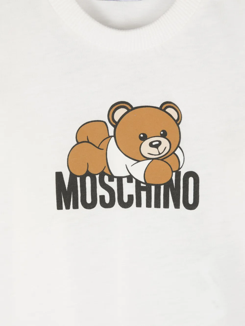 Подробнее о товаре: • белый • органический хлопок • ткань джерси • декор Teddy Bear • круглый вырез • короткие рукава • прямой подол • застежка на кнопках на плече • Ответственный выбор: В составе этого товара есть органический хлопок. Его производитель не использует химические вещества, пестициды и искусственные удобрения и внедряет методы, которые помогают сохранить биоразнообразие, улучшают качество почвы и сокращают потребление воды.