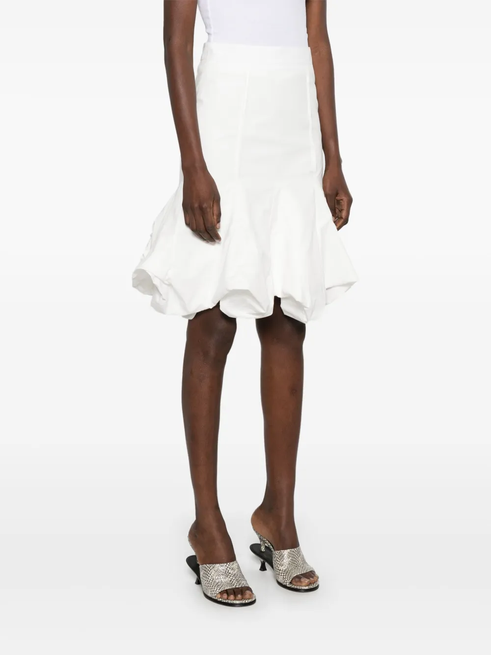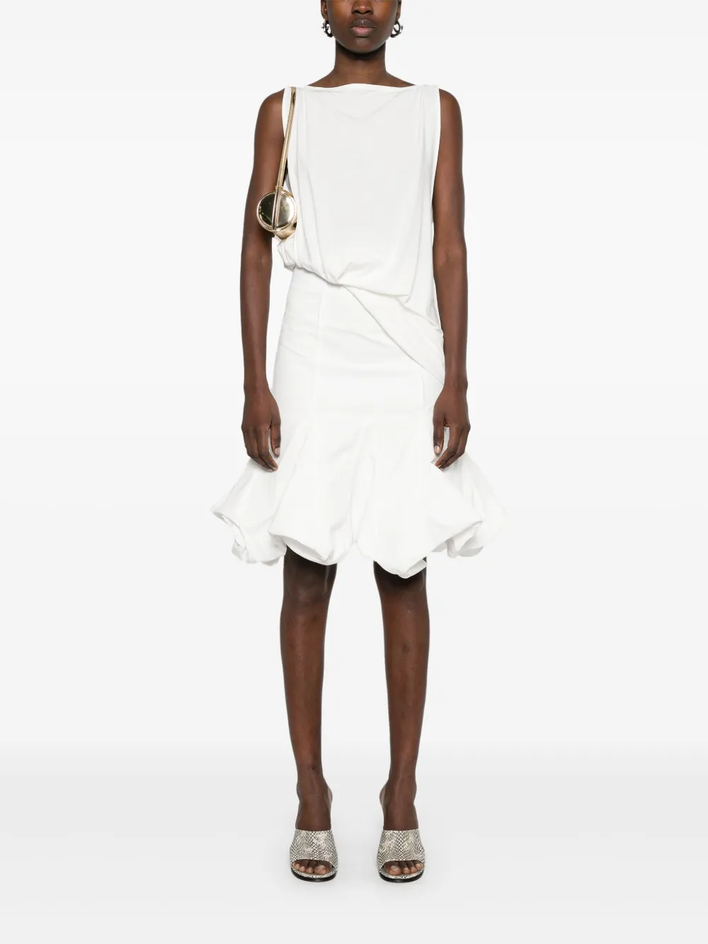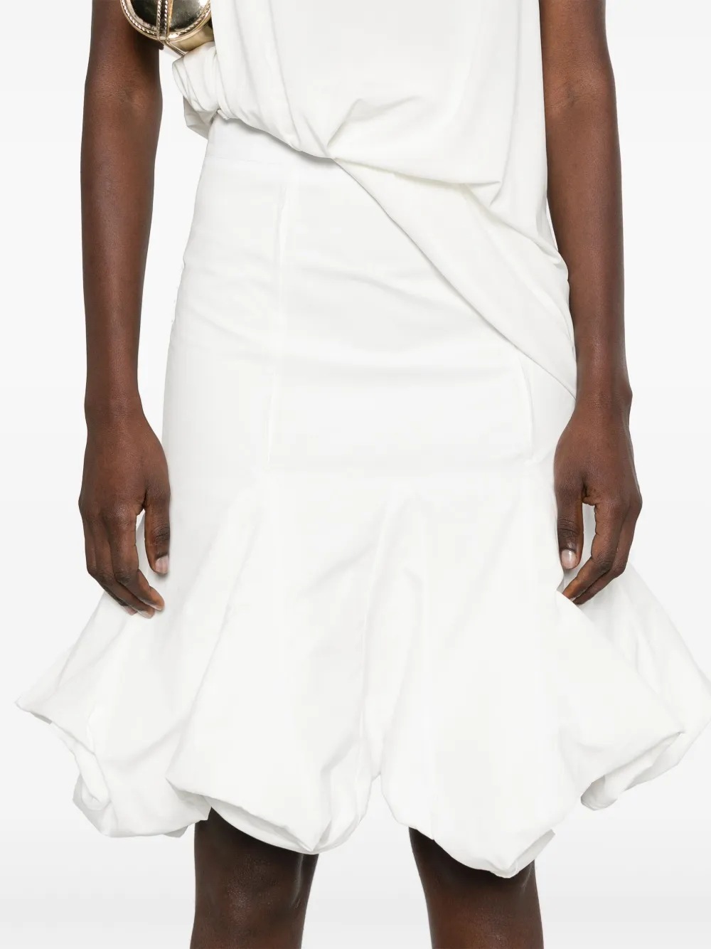 Белая потайная застежка на крючок и молнию сбоку, шнуровка сзади, асимметричный подол, дизайн в форме пузыря