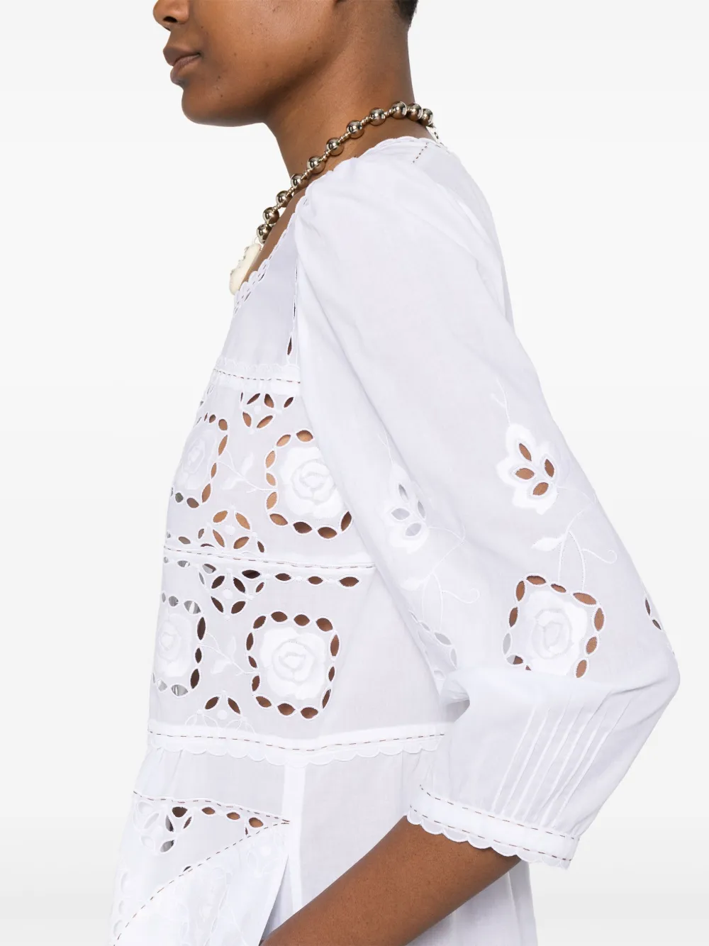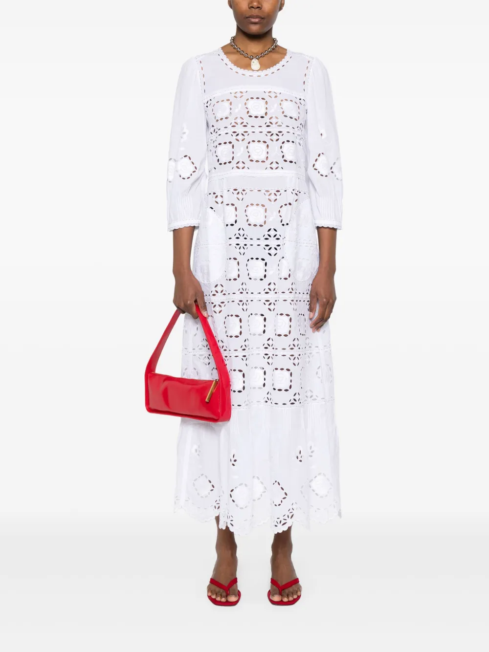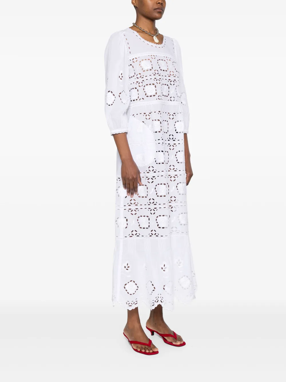 Белый, два боковых кармана, круглый вырез, рукава три четверти, фестончатый подол