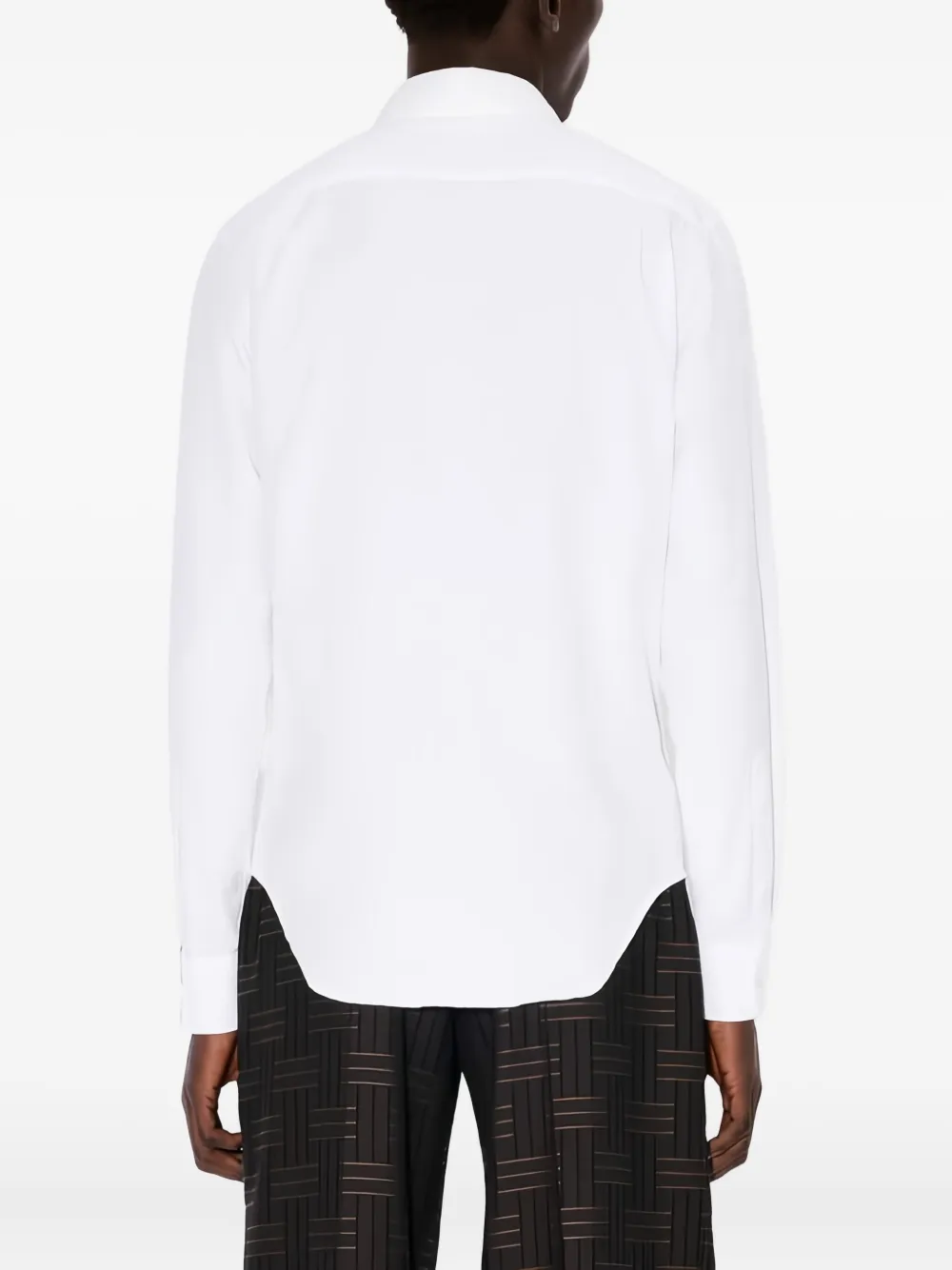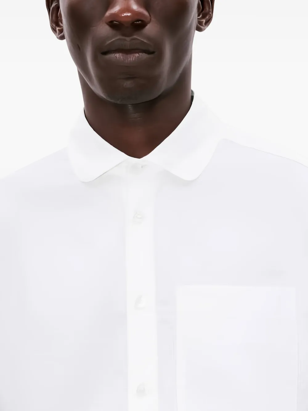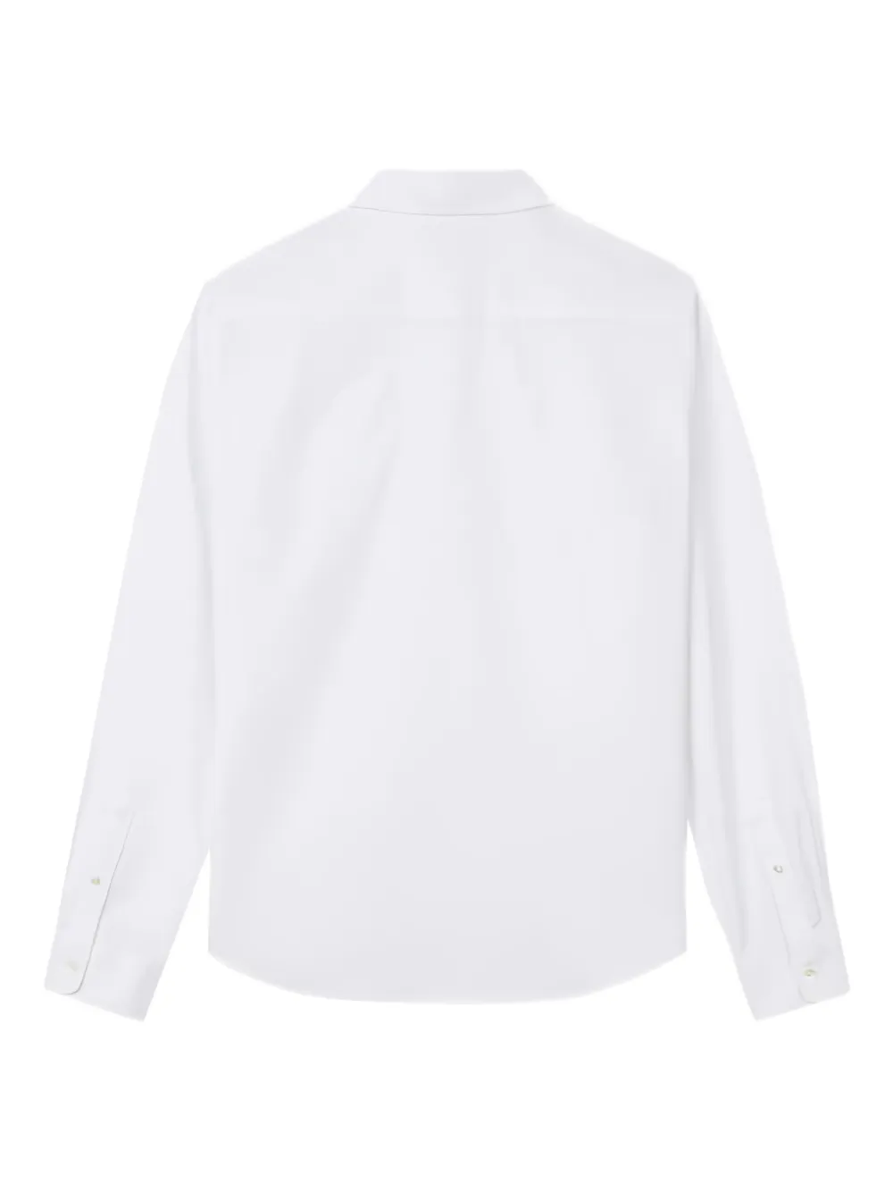 Белый заостренный воротник, один нагрудный карман, застежка на пуговицы, длинные рукава