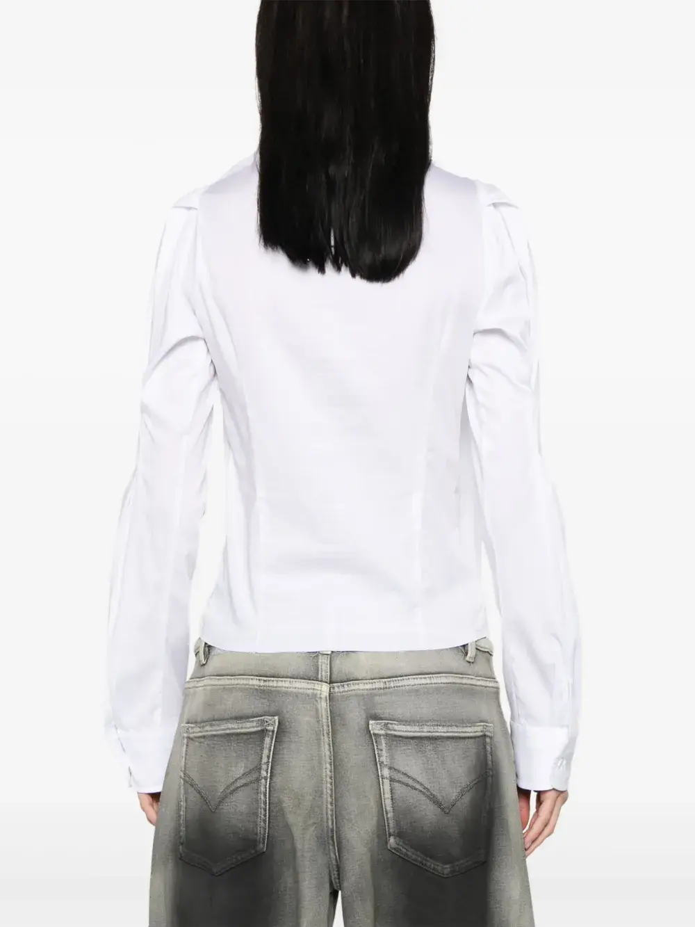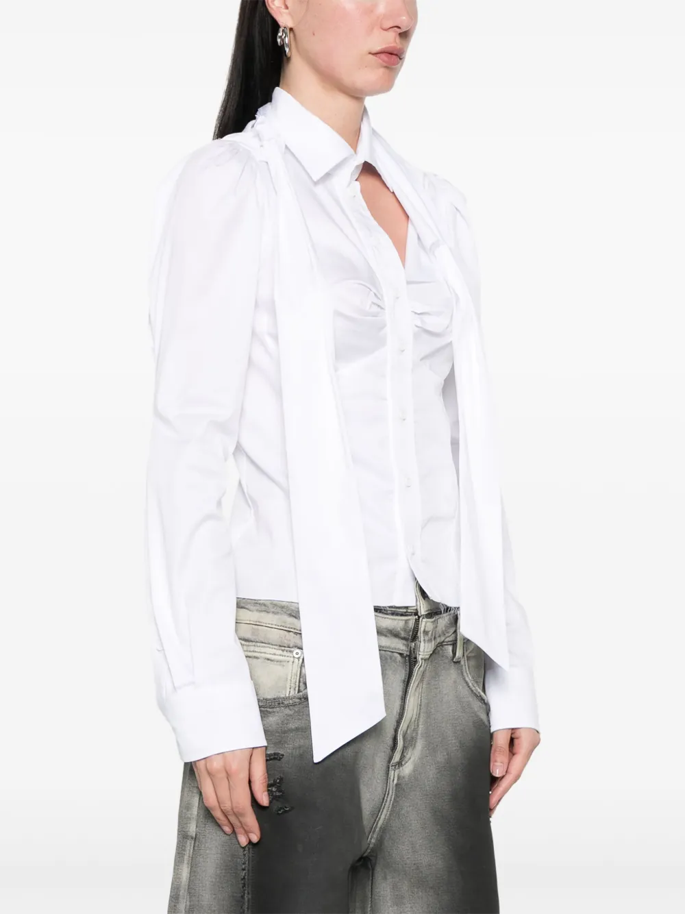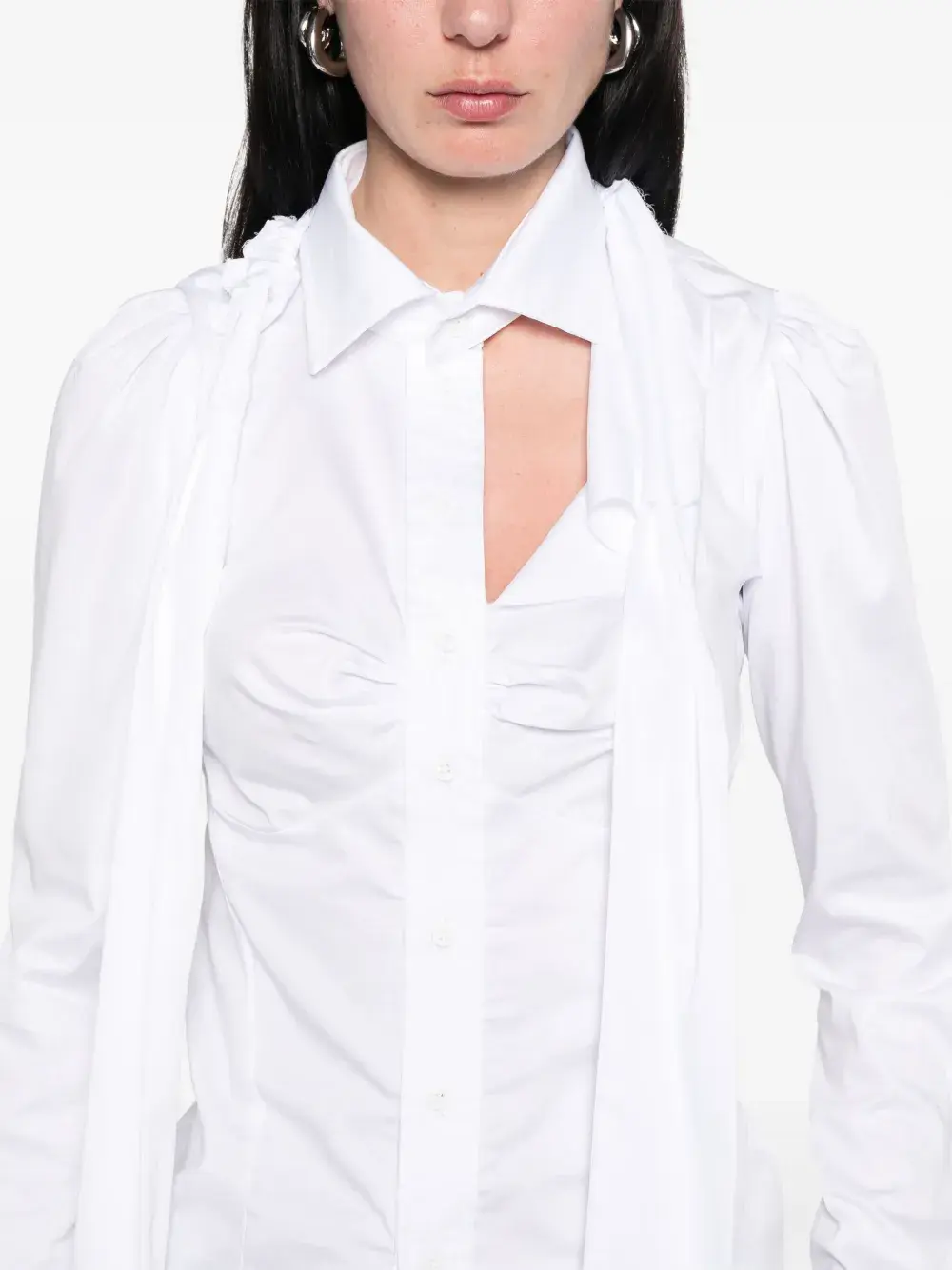 Белая застежка на пуговицы спереди, манжеты на пуговицах, драпированные детали, вырезы