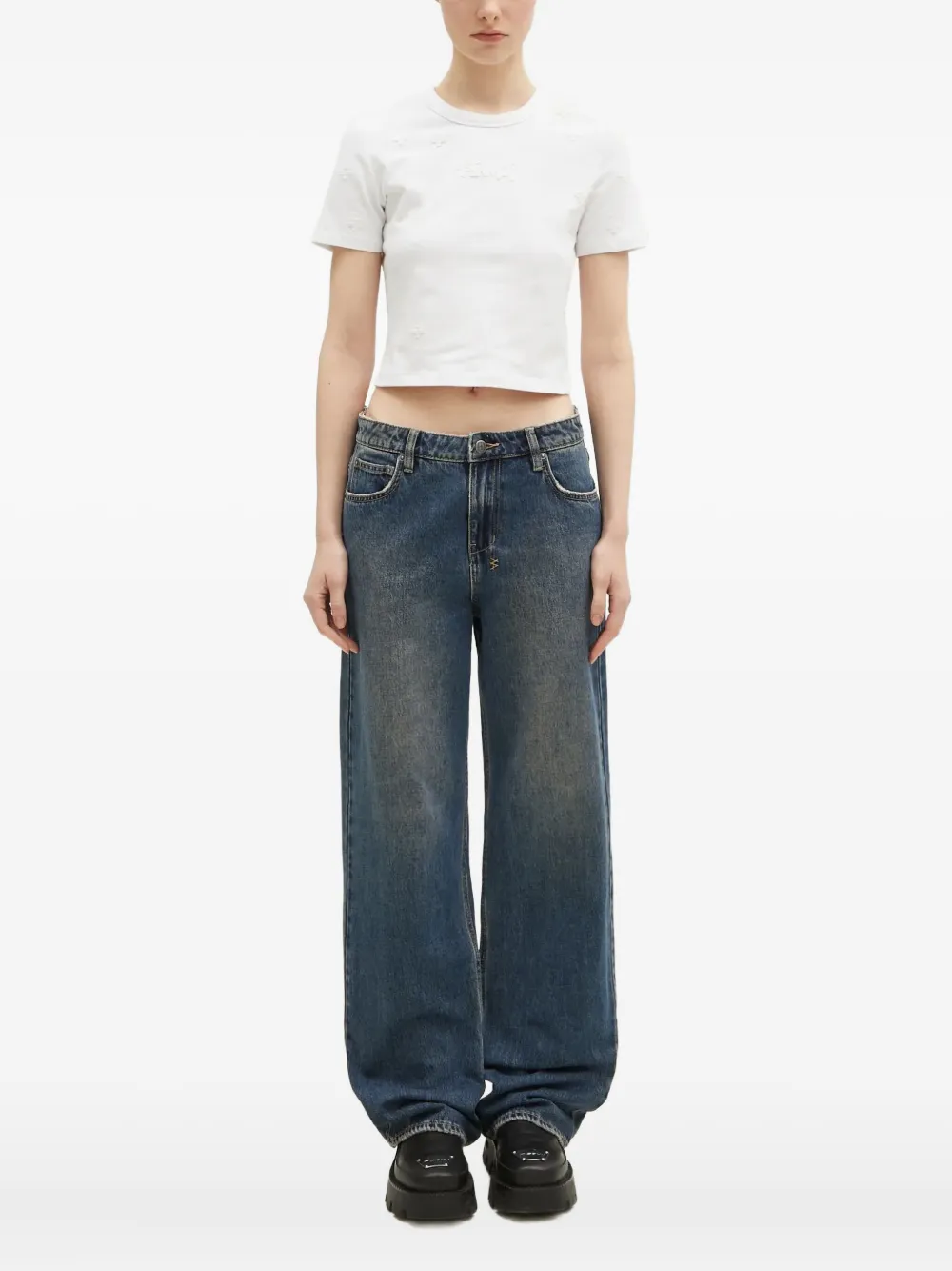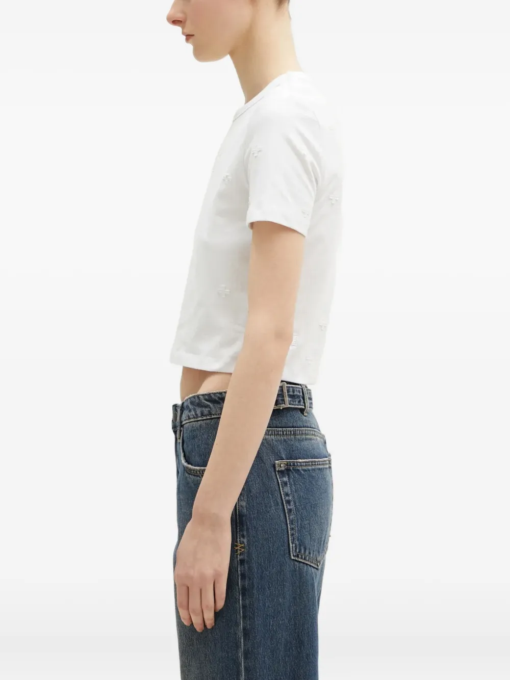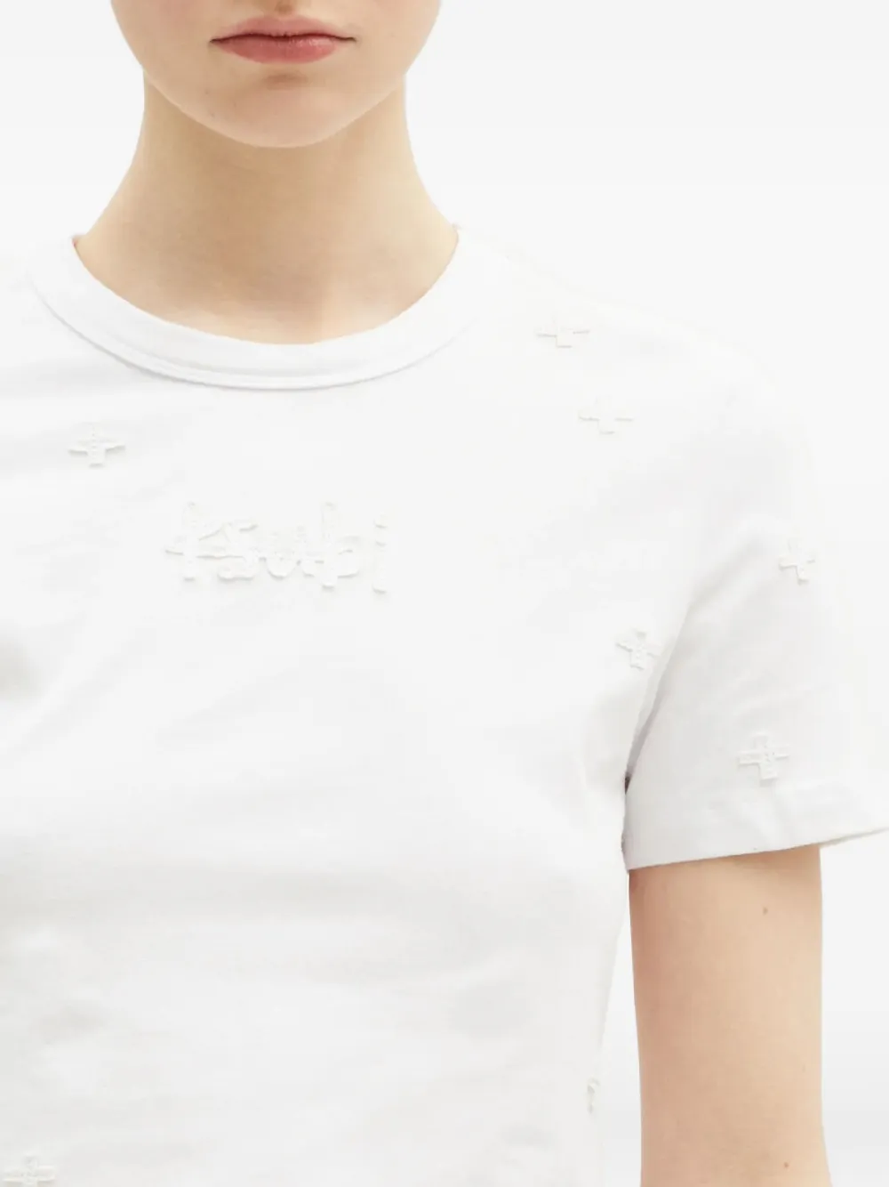 Белый с короткими рукавами, круглым вырезом, вышитой деталью