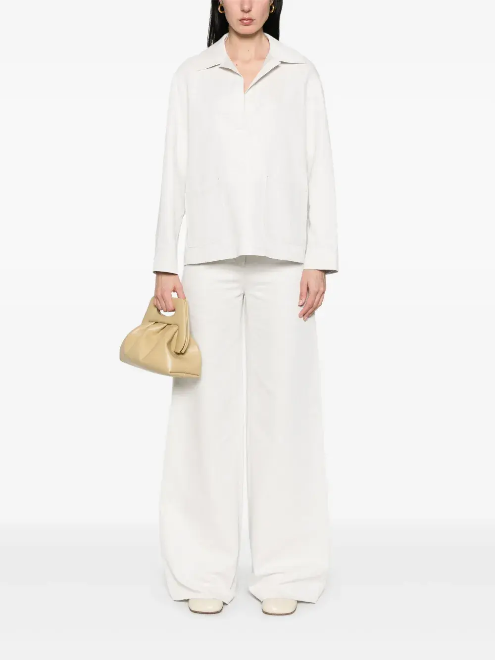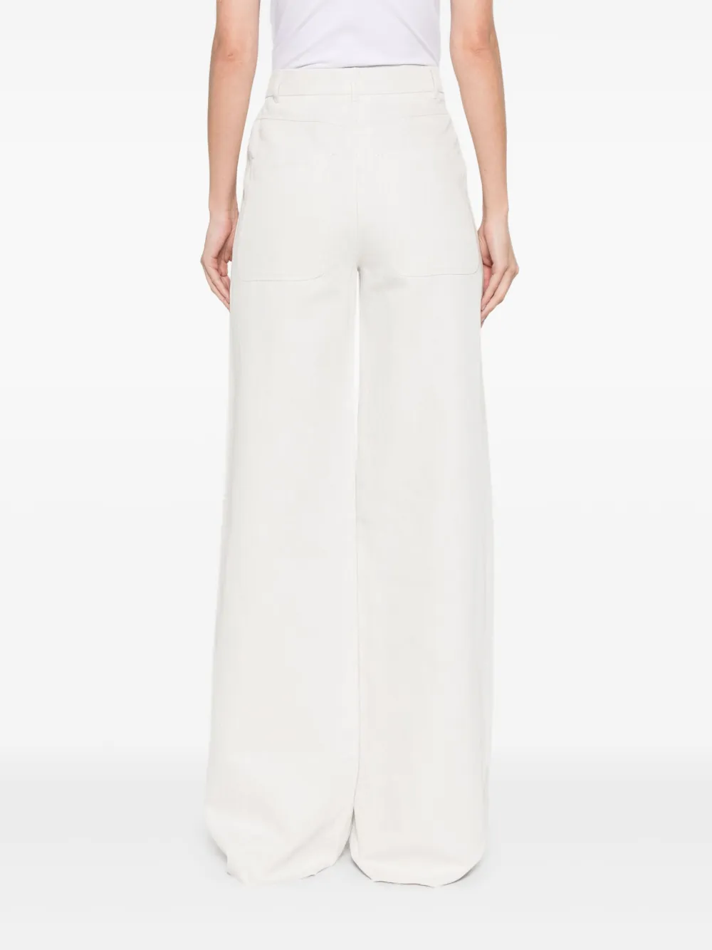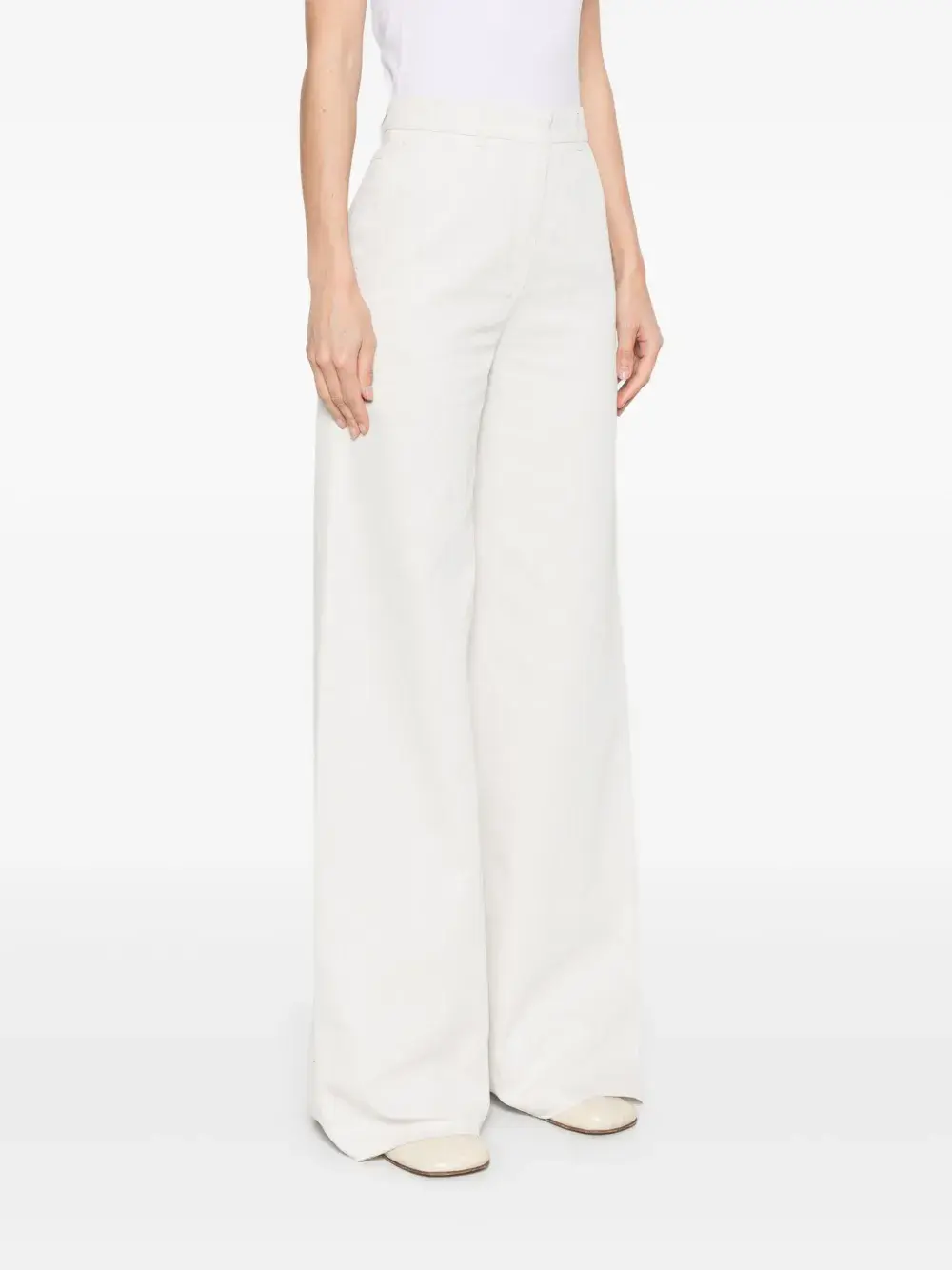 Белая потайная застежка на пуговицу, крючок и молнию спереди, шлевки для ремня, два прорезных кармана по бокам, два накладных кармана сзади