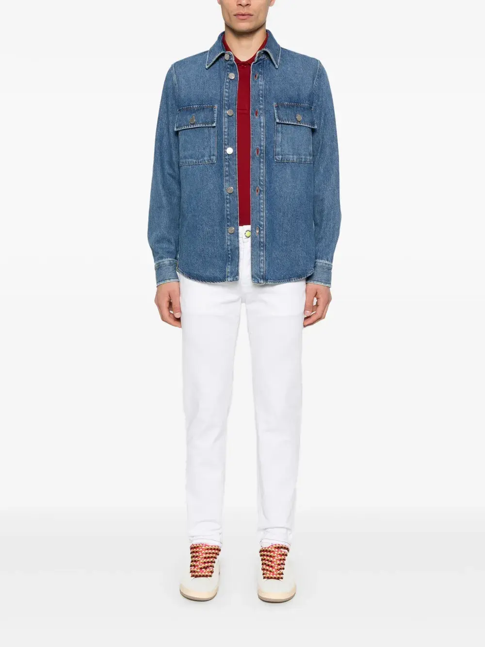 Белая застежка на пуговицы, классические пять карманов, шлевки для ремня, вышитый логотип спереди
