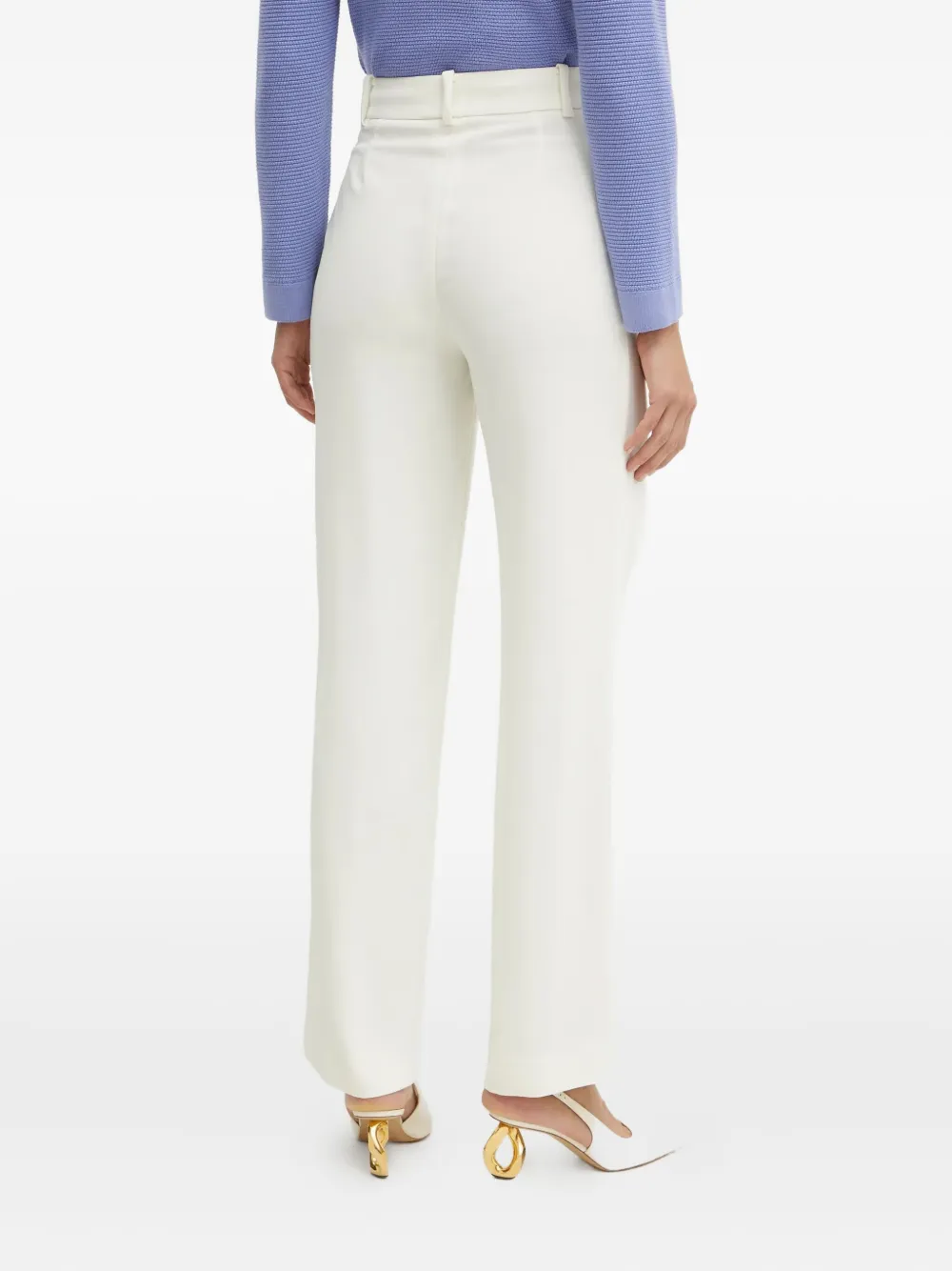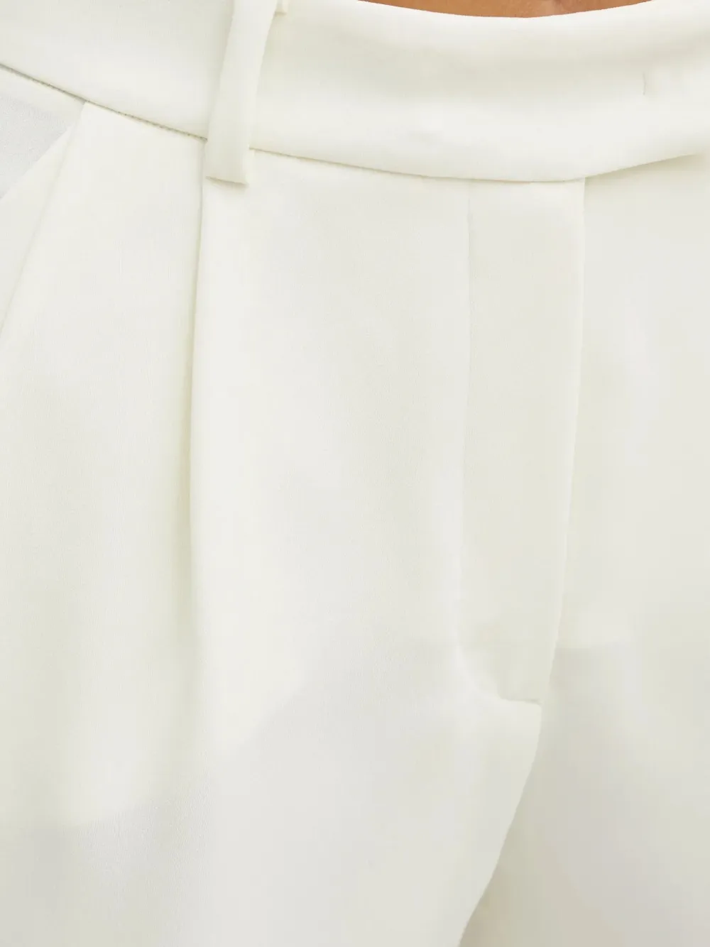 Складки белого цвета спереди, прямой брючины, высокая талия, застежка на молнию и крючок