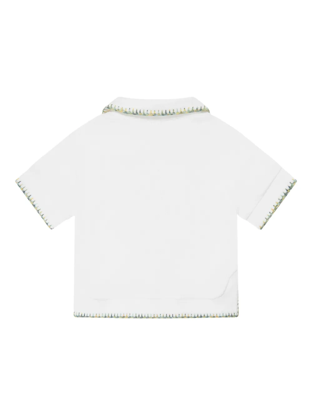 Белая застежка на пуговицы спереди, короткие рукава, вышитый мотив солнца, контрастная строчка, нагрудный накладной карман, воротник-стойка