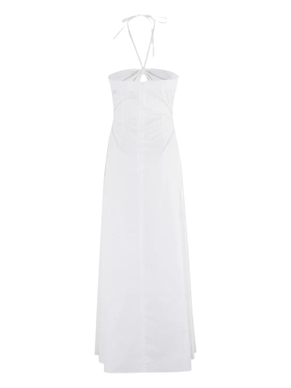 Белая хлопковая ткань, вырез сверху, завязка на горловине, застежка-молния сзади, халтер