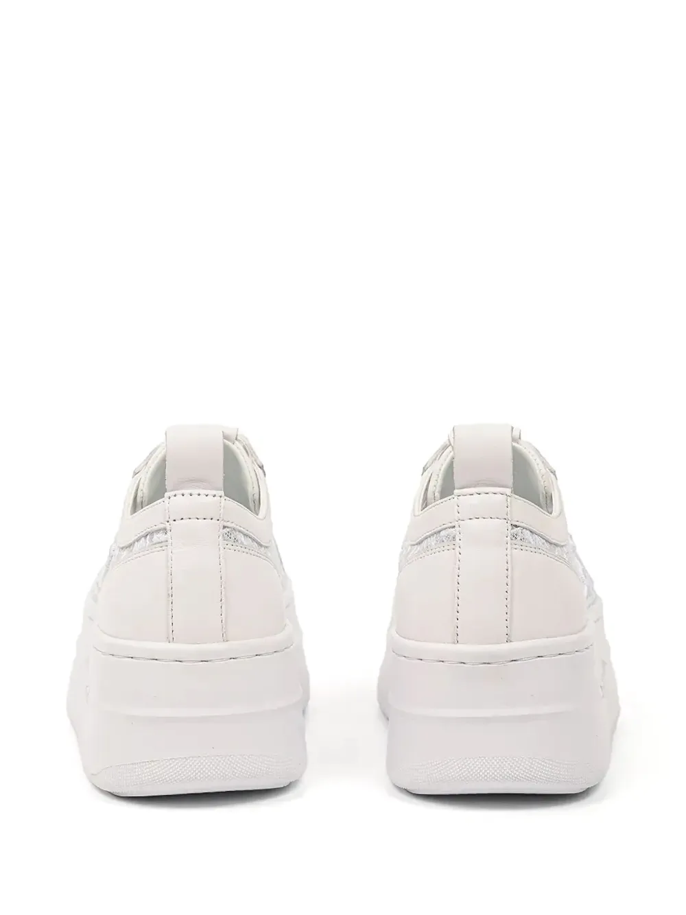 Белая шнуровка спереди, язычок на пятке, вышитый логотип сбоку, плоская подошва
