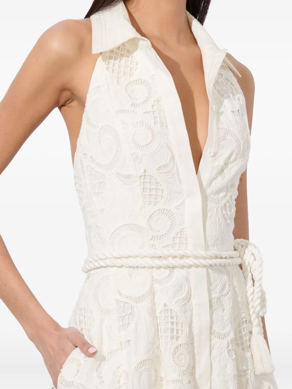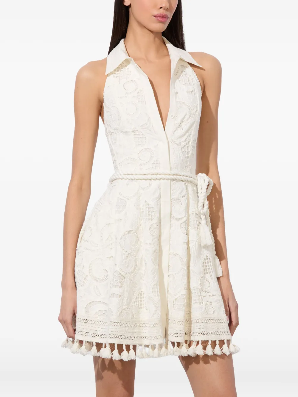 Белая детальная вышивка, воротник-стойка, завязывающийся пояс, отделка кисточками, открытая спина