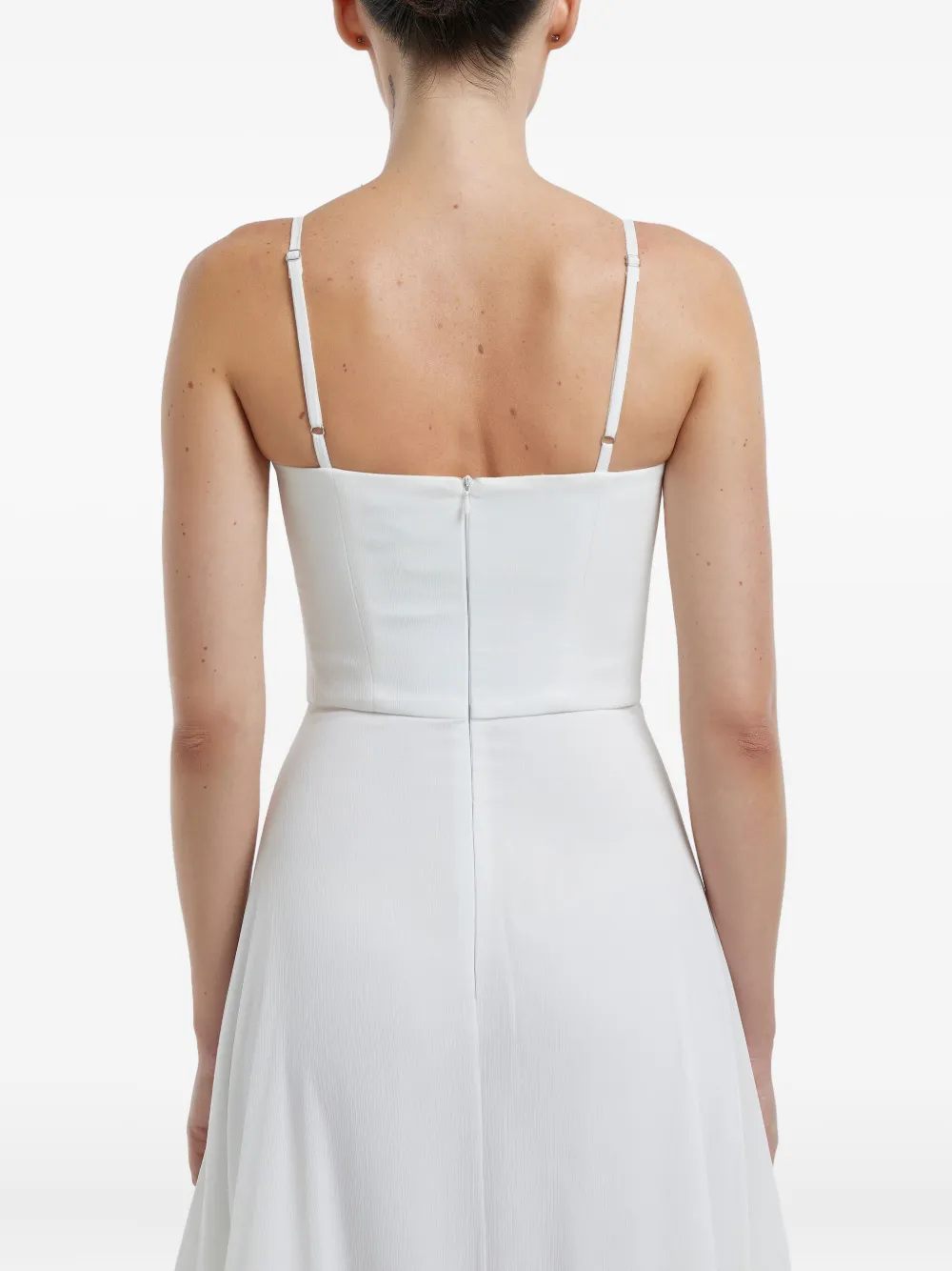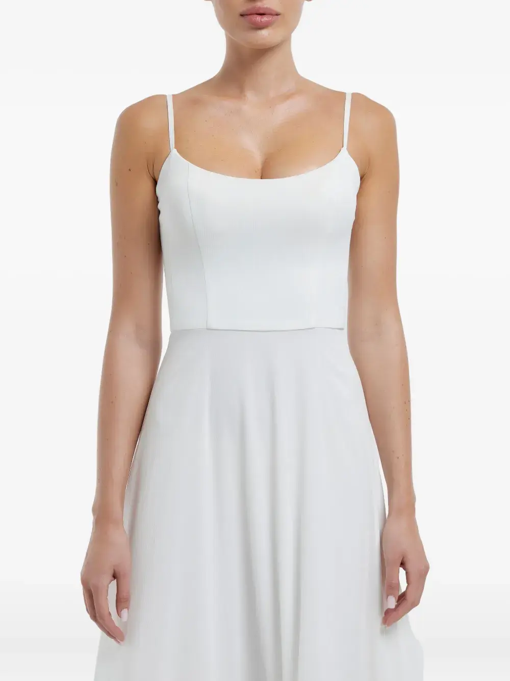 Белая потайная застежка-молния сзади, регулируемые тонкие бретельки, круглый вырез, расклешенная юбка
