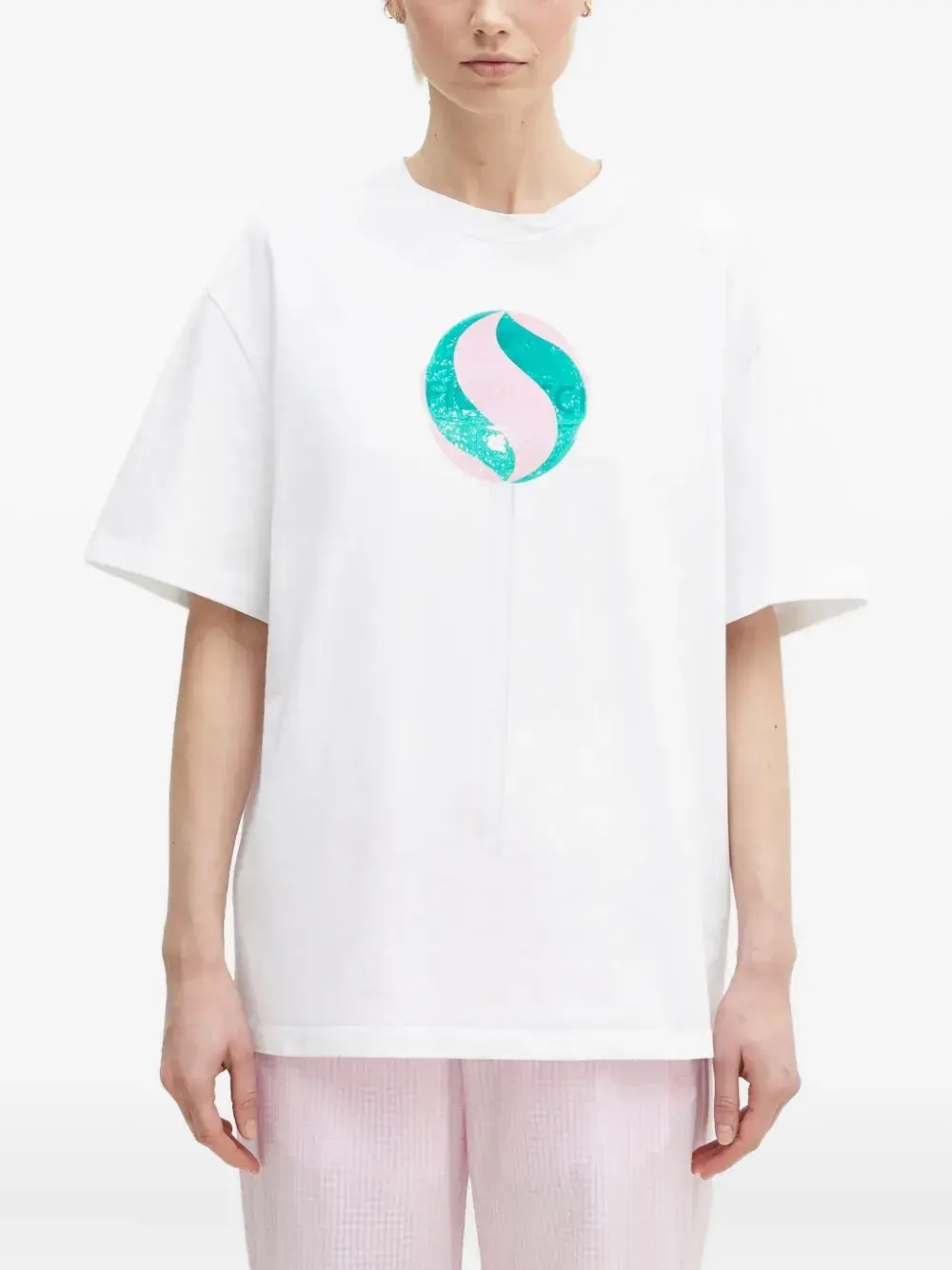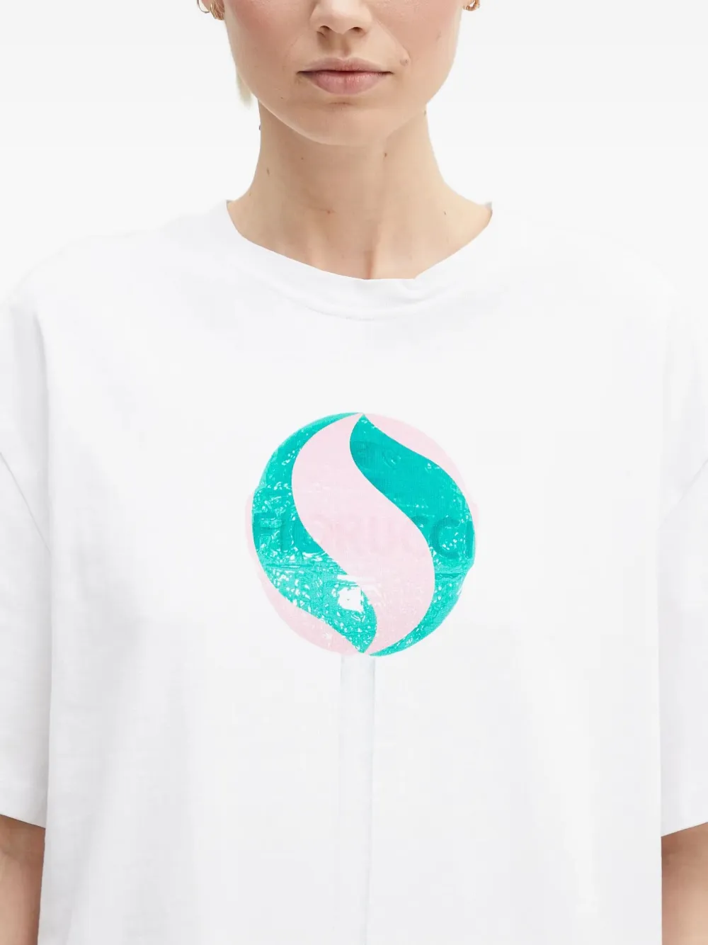 Белый с короткими рукавами и круглым вырезом, с рисунком в виде леденца