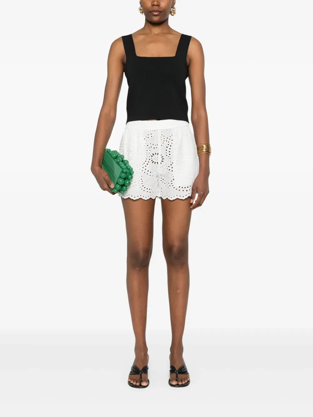 Белый эластичный пояс, два прорезных кармана по бокам, высокая талия, фестончатый край