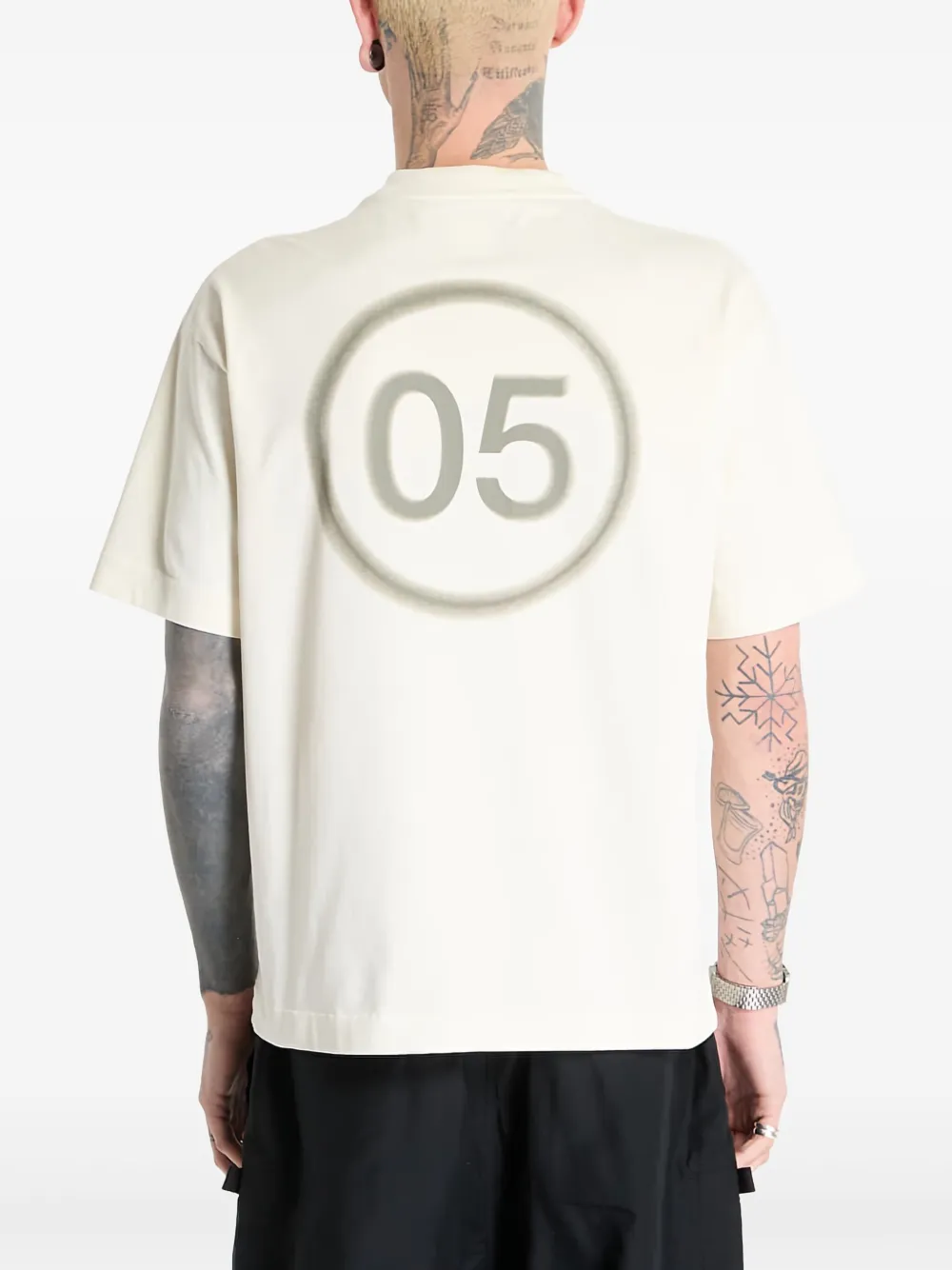 Белый логотип на груди, графический принт сзади, круглый вырез горловины, короткие рукава, прямой подол