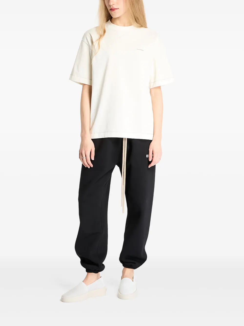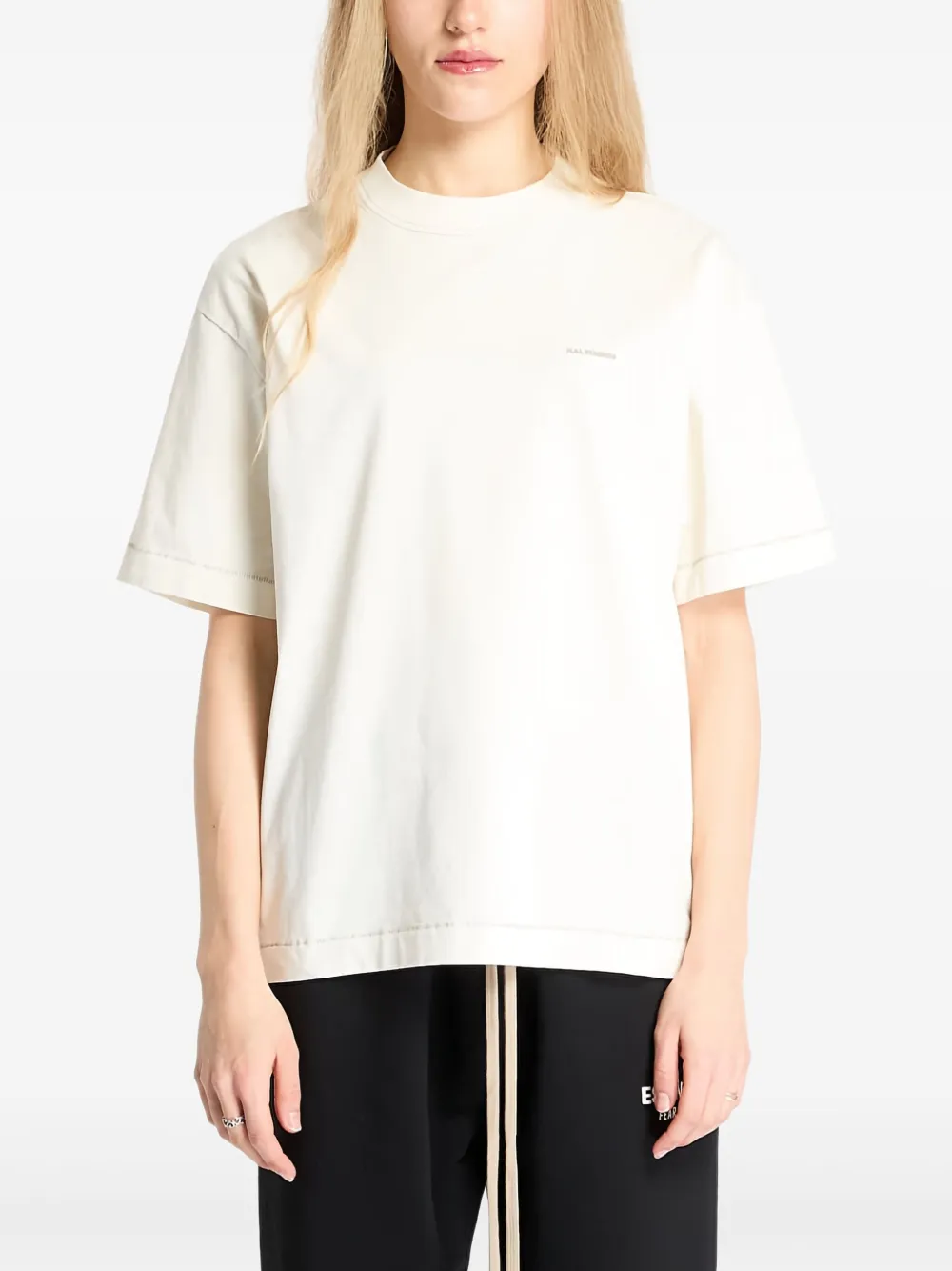 Принт с логотипом белого цвета на груди, круглый вырез горловины, короткие рукава
