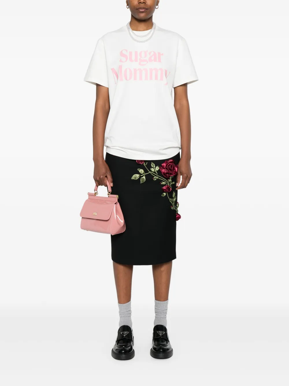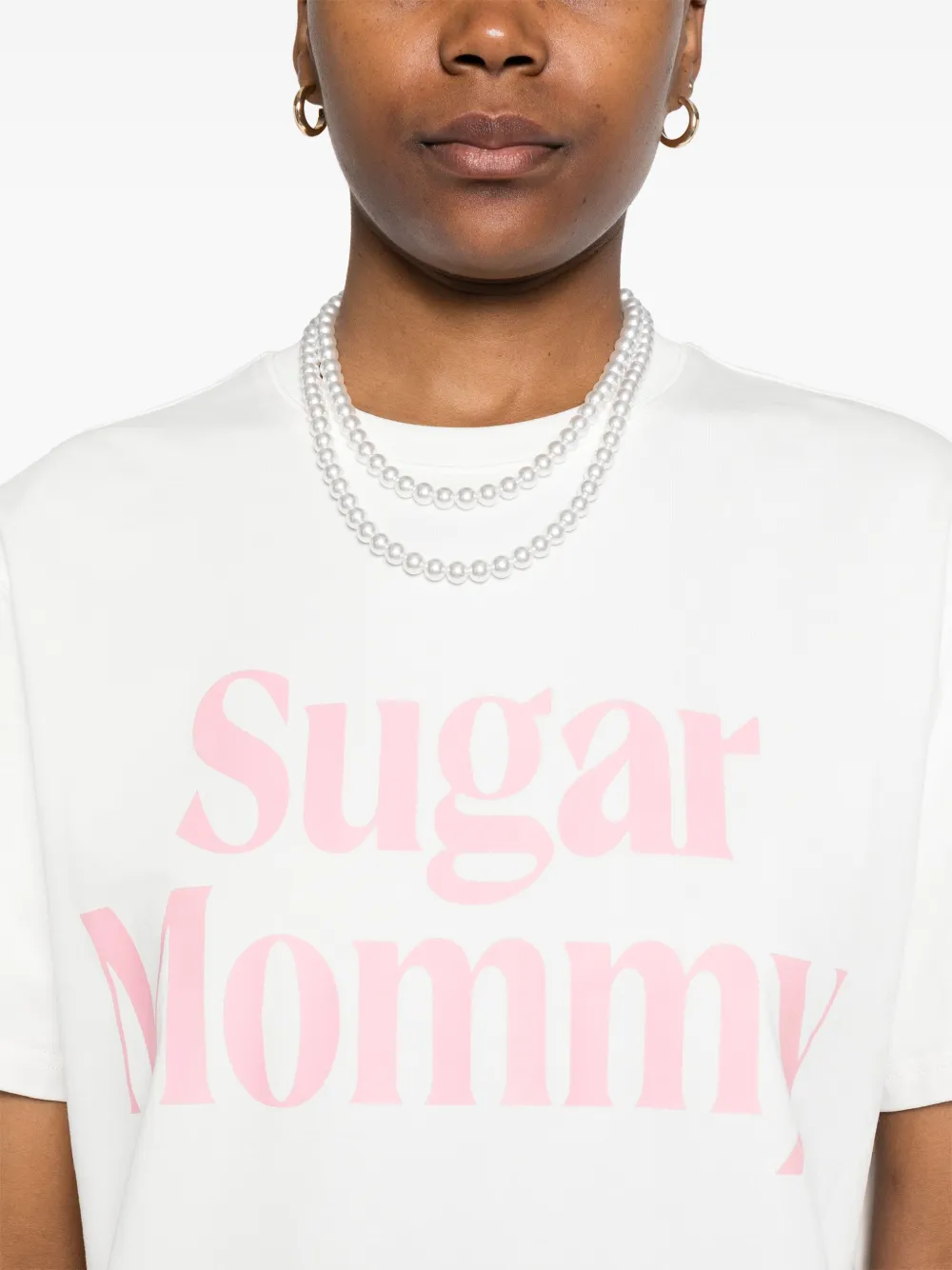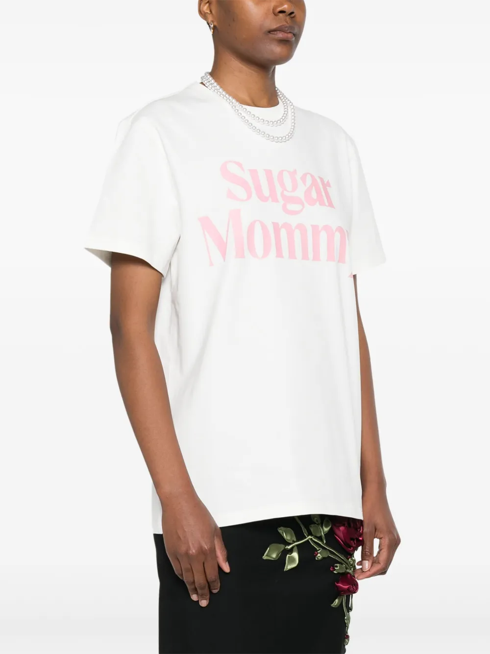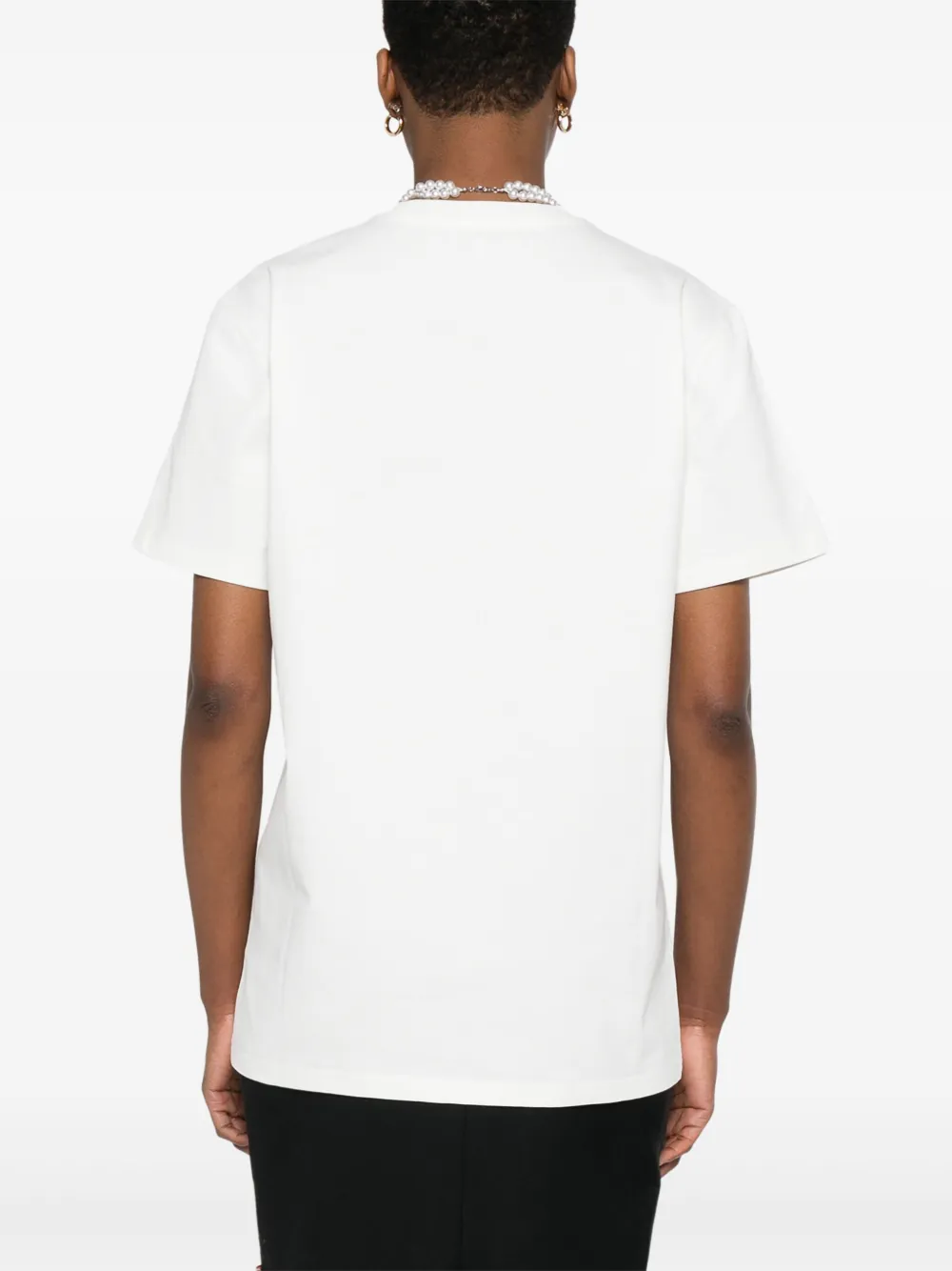 Белый круглый вырез горловины, графический принт на груди, короткие рукава, прямой подол
