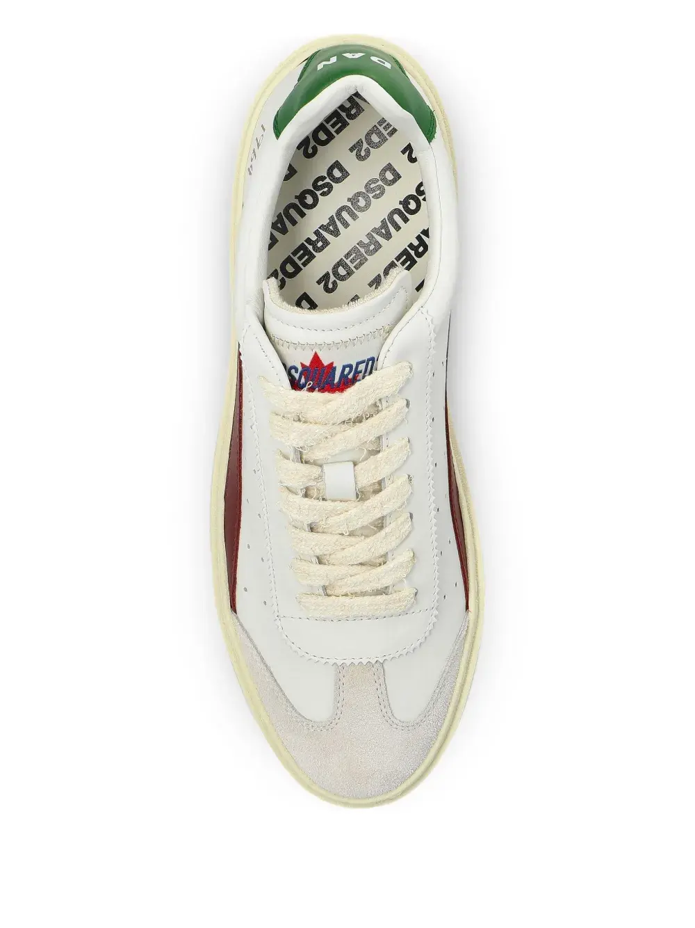Белые бордовые и зеленые вставки, шнуровка спереди, тисненый логотип сбоку, резиновая подошва