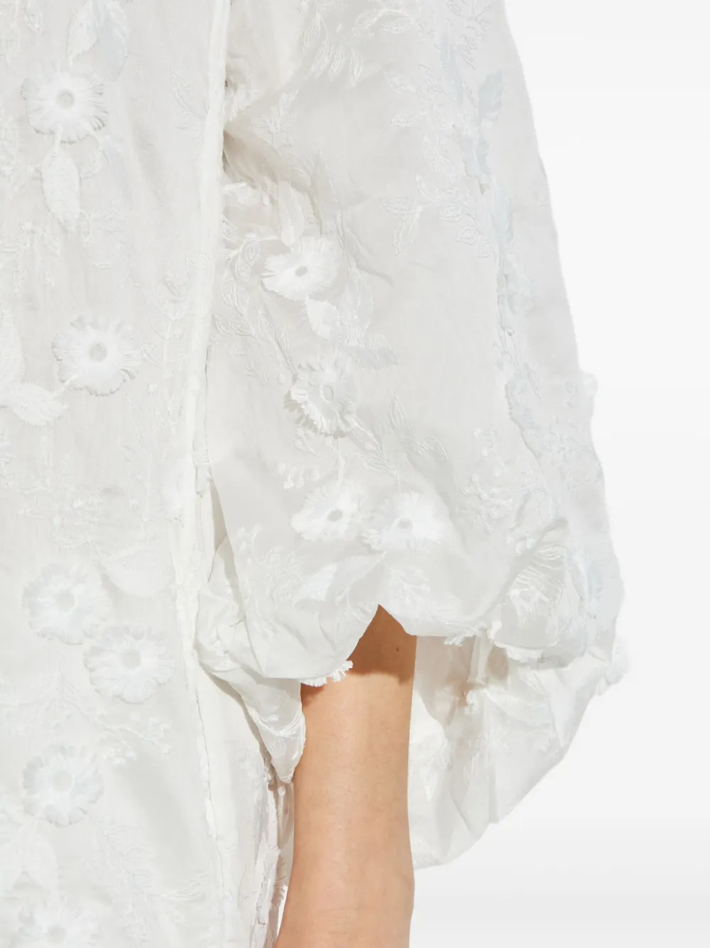 Белая цветочная вышивка, рукава-фонарики, круглый вырез сзади, деталь в виде замочной скважины