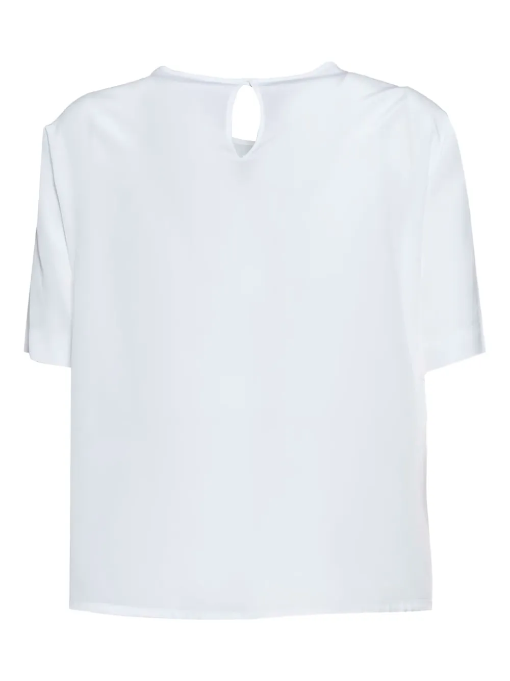 Белый круглый вырез, короткие рукава, кулиска, слегка присборенные плечи
