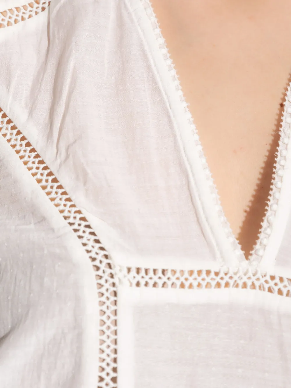 Белый V-образный вырез, рукава-буфы, вышитый узор, присборенная спинка