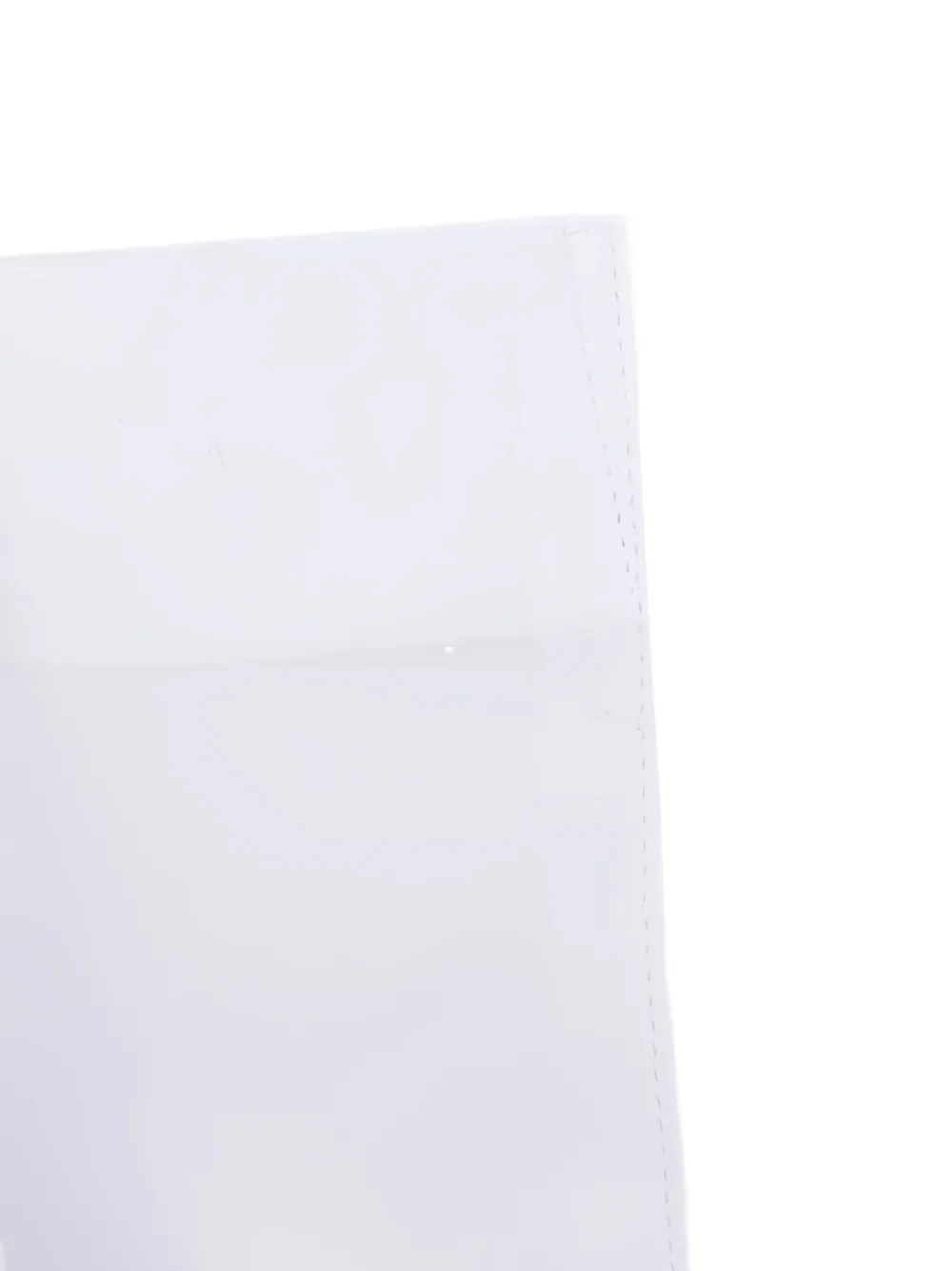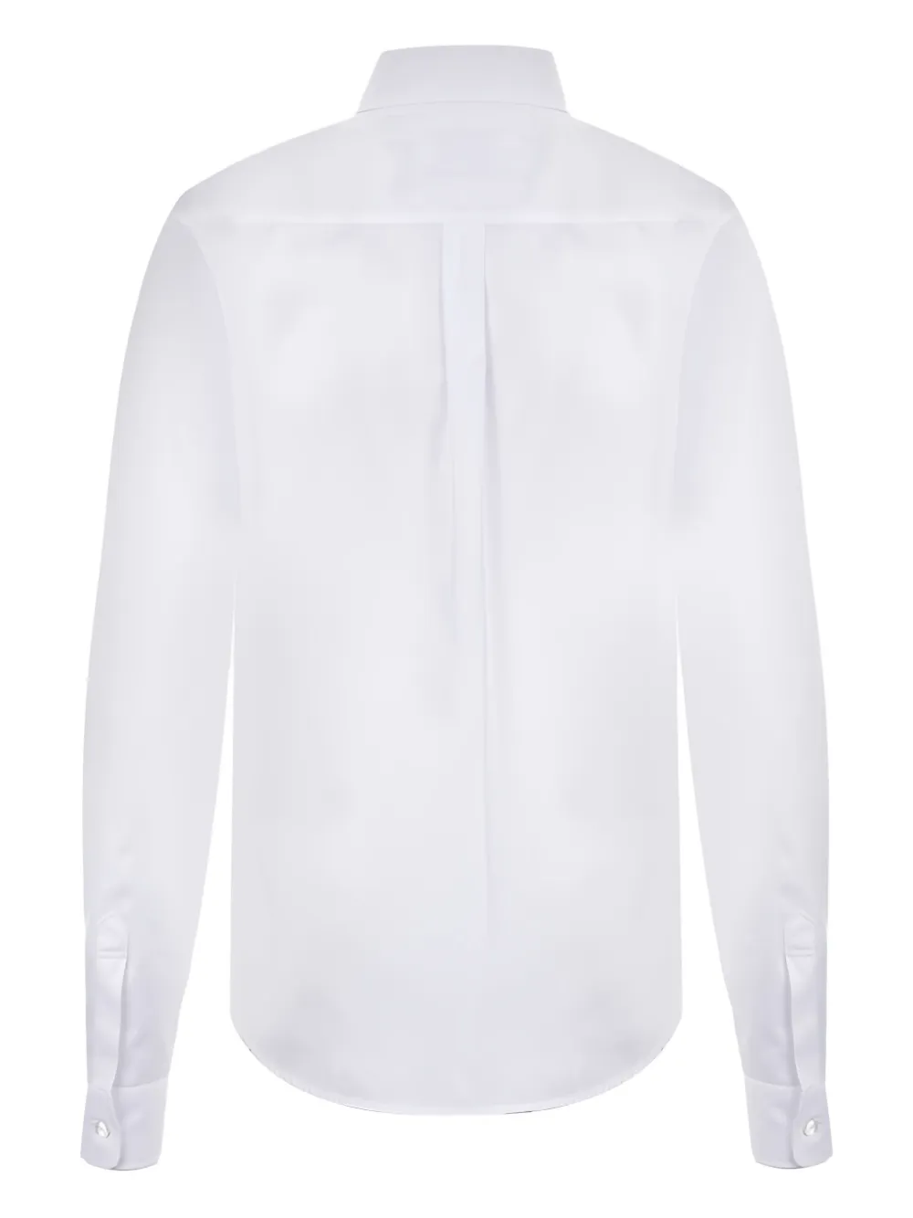 Белый классический воротник, застежка на пуговицы, длинные рукава, манжеты на пуговицах, нагрудный накладной карман, закругленный подол